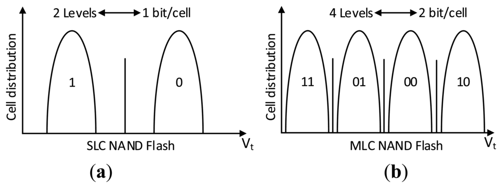 MLC NAND flash memory adopts a multi-page architecture [20] to reduce program disturbances and improve the program speed at the same time. Under this multipage architecture, every two pages form a pair of programmable pages called shared pages. These two pages are further defined as the Least Significant Bit (LSB) and the Most Significant Bit (MSB) pages. For a pair of shared pages, allocation of the data in LSB or MSB pages determines the distortion level of the MLC NAND flash which can directly affect the reliability of the corresponding physical page. Normally, the cell of MLC NAND flash is firstly programmed into two low voltage states, then other two voltage states which represent the information of the MSB page are generated by the second programming process as shown in Figure 2b. Therefore, the MSB page has much lower program distortion as that of the LSB page and much higher reliability because it can directly avoid distortions induced by the first step of the programming process.