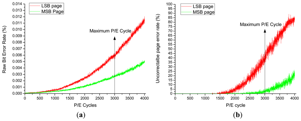 ECC is widely used to reduce the bit error rate of NAND flash memory devices. Combining ECC with the different location of the data, data of the MSB pages has much lower error rates. We tested the raw bit error and the effect of ECC using Micron's MLC flash package 29F64GCBAAA with capacity of 64 Gb and a maximum of 3000 P/E cycles. The results are shown in Figure 3. The raw bit error rate for two different locations of the data is compared in Figure 3a. In this experiment, we program both of LSB pages and MSB pages in ten blocks and analyze the raw bit error rate of the LSB page and the MSB page, respectively. It can be observed that the data allocation has great impact on the raw bit error rate, and the data of MSB pages can achieve a much lower level raw bit error rate than the data of LSB pages. By combining this with ECC, the uncorrectable page error rate can be further reduced (by up to 98.10% of page errors) as shown in Figure 3b. At the time of the maximum 3000 P/E cycles of the lifetime of the tested MLC NAND flash and using 3-bit error correctable BCH code, page errors of over 50% were incurred for the LSB pages, while a reasonably low error rate was maintained by allocating data into MSB pages even after the lifetime of the MLC NAND flash.