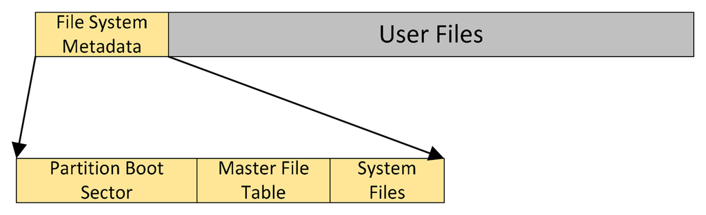 In modern file systems, such as NTFS, every sector on an NTFS volume that is allocated belongs to some file. The file system metadata is also part of a file. Figure 5 illustrates the layout of an NTFS volume when formatting has finished. The first file on an NTFS volume is the Master File Table (MFT), which contains a set of files maintaining the metadata used to implement the file system structure. In NTFS, the location of MFT is fixed. The NTFS file system reserves the first 16 records in the MFT for the information about these metadata files. The NTFS file system uses about 1 MB for the metadata files and the first 16 records in the MFT.