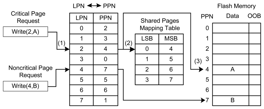 If the page does not contain metadata (lines 16–17), the MSB allocation strategy will bypass the shared pages mapping table. Such write requests will be directly issued to available free pages in the sequential manner of programming. Both the LSB and MSB pages can be utilized to store normal data. Figure 6 shows an example of the MSB allocation strategy. For the write request (LPN #2, A), where A is the content to be written in the NAND flash and LPN #2 belongs to a critical page, the MSB allocation strategy will search the logical page number to the physical page number (PPN) addressing mapping table maintained by the FTL and find the corresponding PPN (PPN #4). It will further check the shared pages mapping table provided by the chip manufacturer. This table indicates that PPN #4 belongs to MSB pages. The MSB allocation strategy will then write content A to the MSB page. For the write request (LPN #4, B), which denotes a non-critical page, our strategy will bypass the search operation in the shared pages mapping table and issue a write operation to the PPN provided by the FTL (i.e., PPN #7).