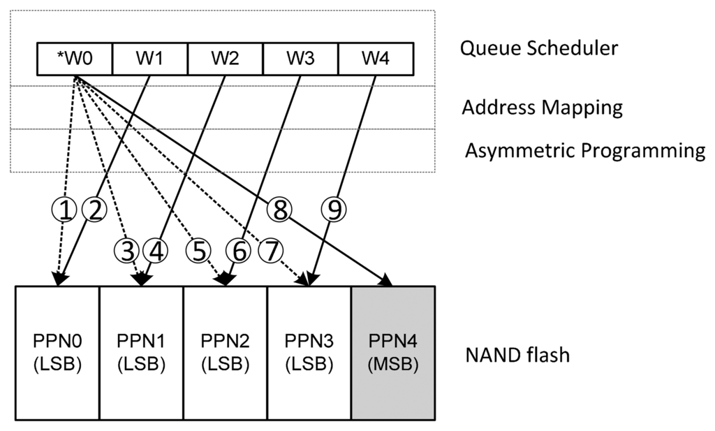Asymmetric Programming is an address mapping strategy that introduces transparent management between the file system and hardware to protect the metadata from errors. The system architecture of Asymmetric Programming is shown in Figure 4. In the architecture, the host system and the storage system are connected through the host interface. Most widely used host interfaces, such as SATA II and USB (2.0 or 3.0 version), support outstanding requests. The storage system can serve multiple “out-of-order” requests and form a queue. The request queue scheduler is utilized to manage the queue to optimize the I/O performance by scheduling the requests in the queue.