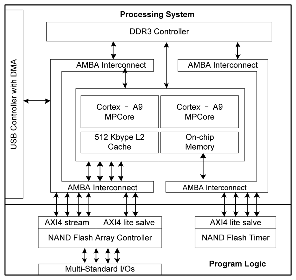 All of the firmware were implemented in the Zynq SoC. As shown in Figure 9, the Zynq SoC resource is comprised of two parts: the processing system and the programmable logic. The processing system has dual ARM cores and other peripheral controllers, such as USB 2.0 interface controller and a DDR3 controller. The NAND flash controller was implemented in the programmable logic, which is a standard Xilinx 7 series FPGA. The programmable logic connects to the AMBA interconnect through 32-bit high-speed GP AXI port with a bandwidth of up to 1 GB/s. We wrapped the NAND flash controller with one AXI streaming interface which can achieve the maximum bandwidth of the AXI interface. One AXI lite slave interface was used to operate the registers of the NAND flash controller, making it possible to take full advantage of the bandwidth of the high-speed High Performance (HP) AXI port of Zynq.