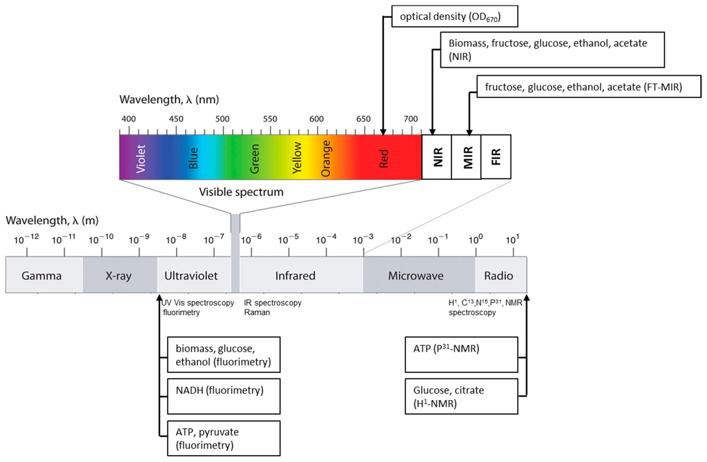 Optical sensors in general offer substantial advantages: they are non-invasive, can detect several compounds simultaneously, and no removal of a sample from the process is necessary [6]. Figure 1 is an overview of optical spectroscopic sensors and their principal applications. Among all of the options, in bioprocess analysis research, sensors based on the near-infrared wavelength (NIR) have gained more and more importance during the last two decades. Several applications are reported in the international literature dealing with NIR technology applied to bioprocess monitoring: from the first ones of Nishinari et al. [7], who described on-line control of glucose concentration during enzymatic starch hydrolysis, and Cavinato et al. [8], who used an external optical-fiber NIR instrument to monitor the alcoholic fermentation, to the more recent one of Jiang et al. [9], who applied NIR to the monitoring of a solid-state fermentation process for protein production, as well as that of Lopes et al. [10], where NIR was used to investigate the effect of process parameters on plasmid production.