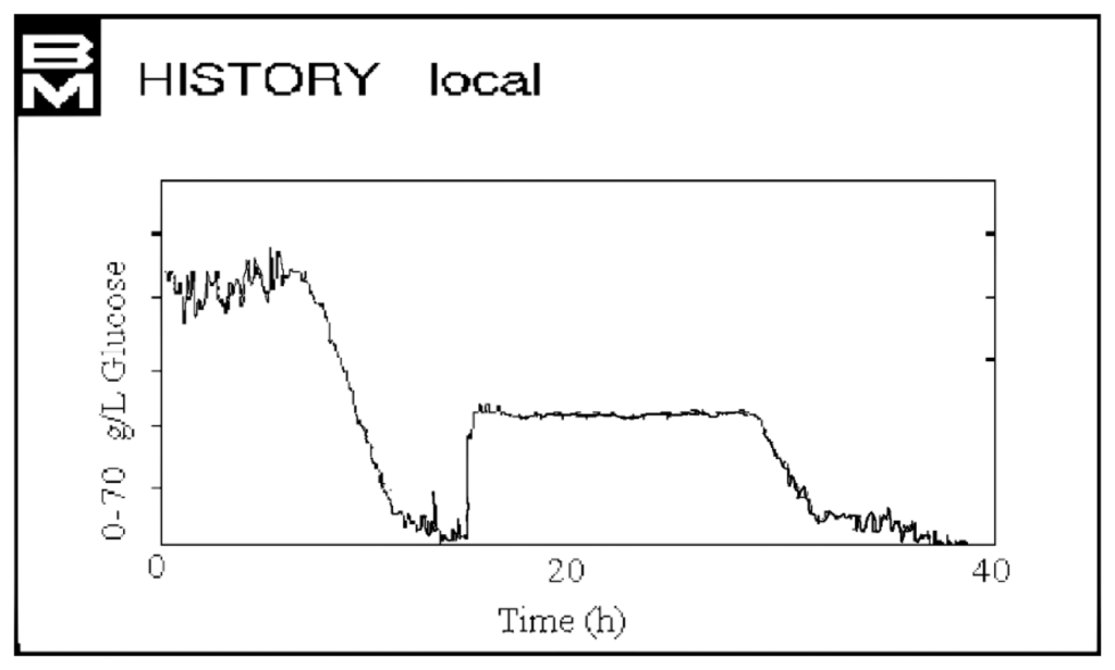 Then, a continuous culture (chemostat) where glucose was the controlled variable (35 g/L), was set up. Figure 10 shows the trend of glucose concentration, kept constant for 24 h, with the medium flow rate as the control variable based on the NIR prediction of glucose concentration inside the bioreactor.