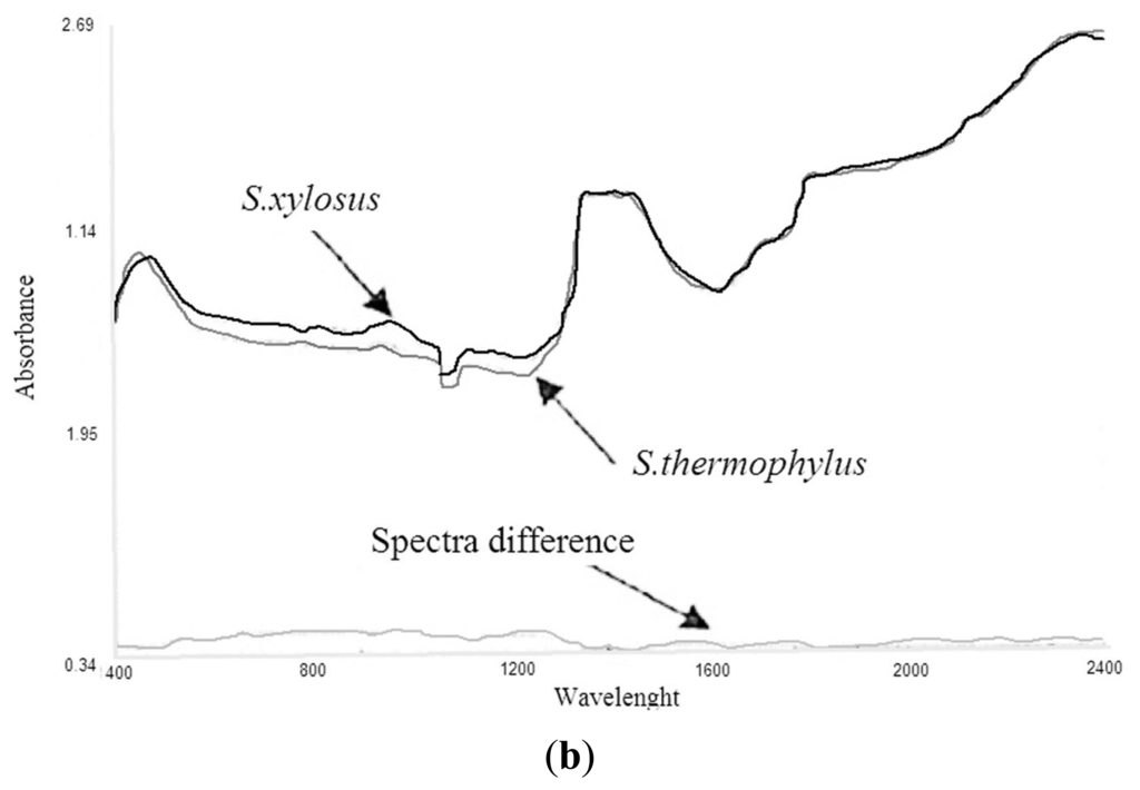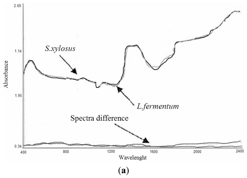 A further aim of this investigation was to evaluate whether NIR was able to discriminate among morphologically different bacteria growing in the same media, in similar fermentation conditions. Using suitable chemometric tools, it was investigated whether, in the NIR spectra, regions or particular wavelengths clearly attributable to one bacteria could be identified. Several studies have been done on the capacity of NIR to discriminate among microbial strains belonging to different species (i.e., bacteria from yeast), thanks to the specific “biochemical fingerprint” of cell membranes [22,23].