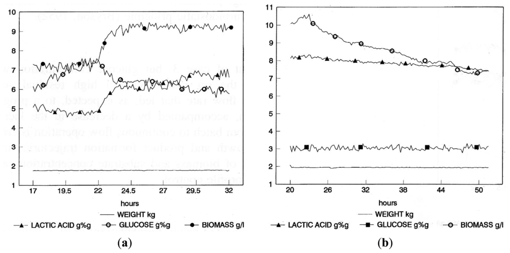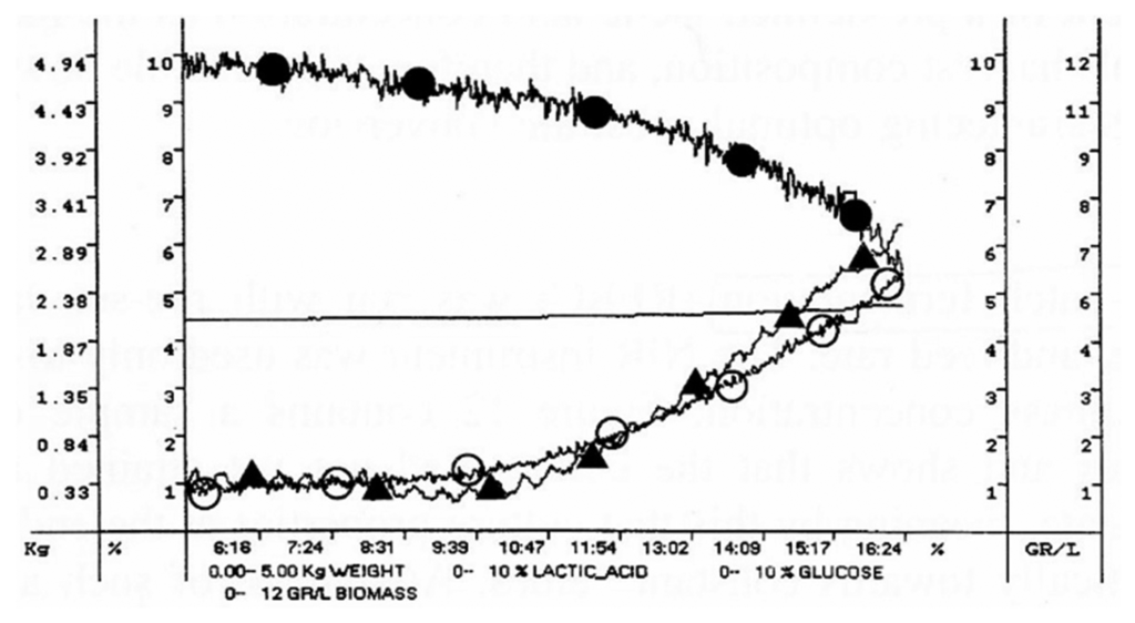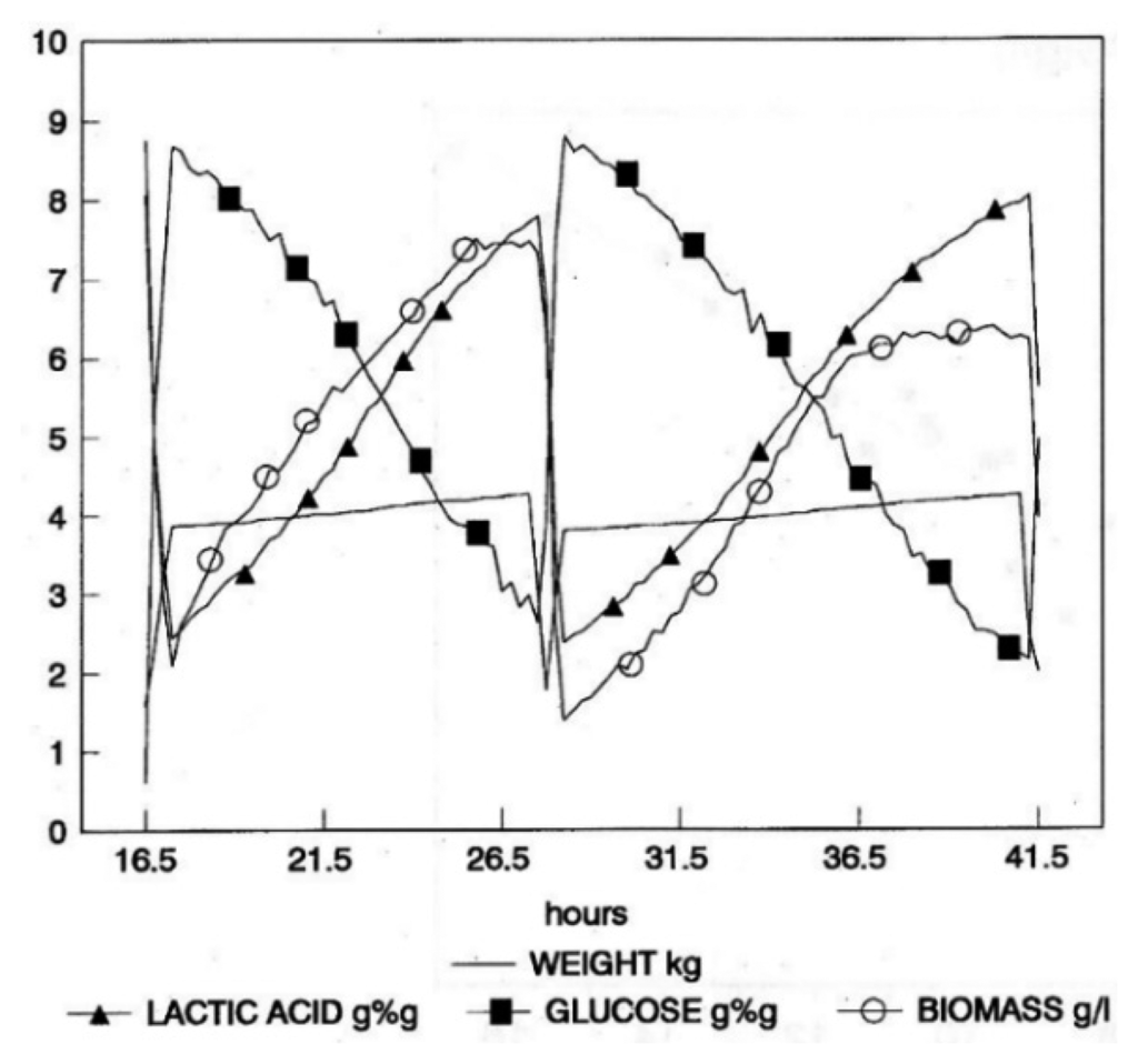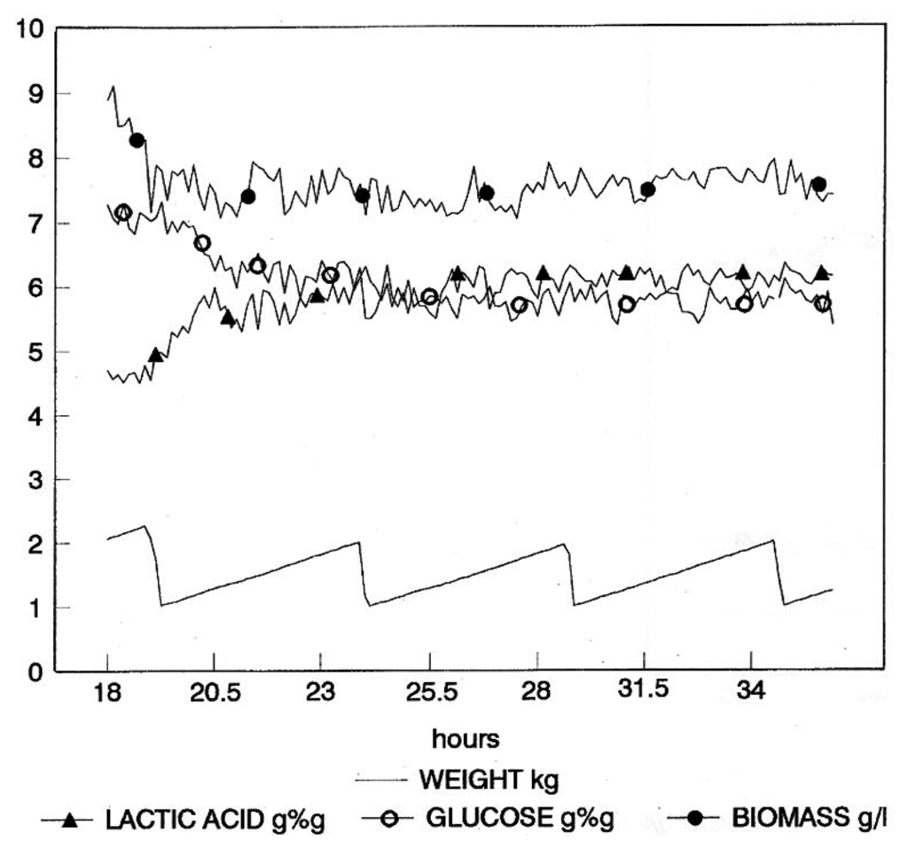 A repeated-batch fermentation (RBC) technique was adopted, where culture removal was triggered by the achievement of a pre-defined concentration of lactic acid. Culture volume was reduced to a pre-determined value, and then, fresh medium was rapidly added to reach the set cultivation volume. Culture discharge and re-fill were automatically managed by the bioreactor weight control system, based on the real-time values supplied by the NIR on-line (Figure 4). Such a simple fermentation strategy is essentially aimed at reducing the non-productive phases of the fermentation. The achievement of a pre-defined lactic acid concentration as the harvesting criterion ensures reproducible harvest composition and, therefore, reproducible downstream processing, in addition to guaranteeing optimal substrate conversion.