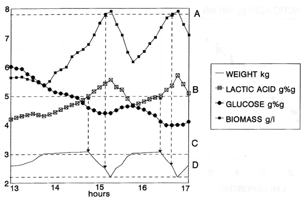 Finally, an experiment of the completely automated management of a process, based only on the real-time NIR results, was attempted. An RBC fermentation with periodic product removal by microfiltration and periodic removal of the excess of biomass was set up (Figure 7). When a preset value of lactic acid concentration (B) was exceeded, the microfiltration module was activated. As a result, the biomass concentration increased. When the biomass threshold (A) was reached, the culture was automatically discharged until a preset volume (D) was left inside the bioreactor. At this point, automatic weight control took over to reconstitute the culture volume to the preset working level (C) by adding fresh medium. A new cycle was triggered by the lactic acid concentration reaching the (B) threshold. The net result of such a strategy is that biomass concentration is kept at the maximum workable level, thereby maximizing the rate of conversion, and lactic acid is kept at the optimal level that combines a low cost of recovery with an acceptable level of product inhibition.