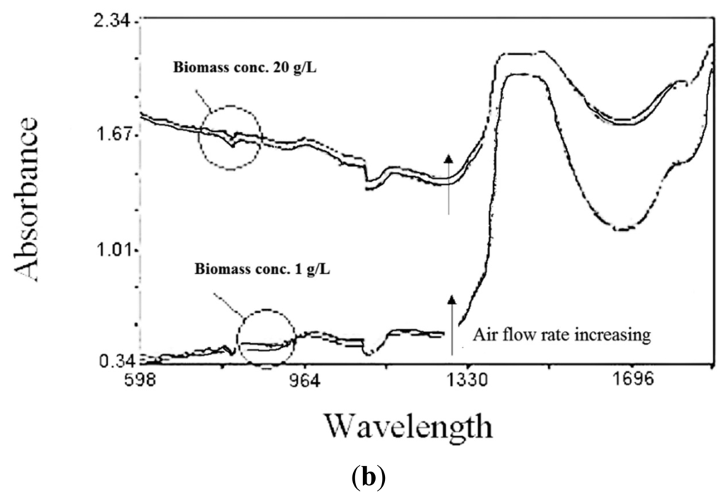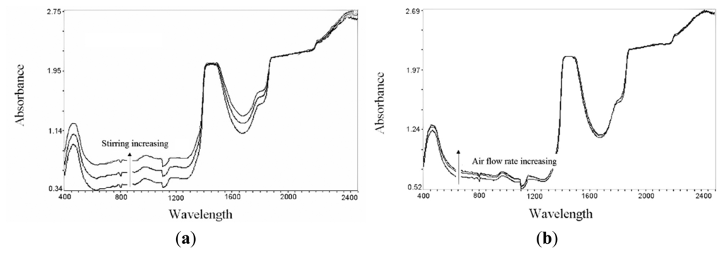 Further research has been carried out with the aim of demonstrating the applicability of NIR spectroscopy also to the in situ monitoring of fermentation. The choice of aerobic bioprocess was made for investigating the possible spectral interferences deriving from heavy aeration and agitation conditions on the spectra signal. Most submerged fermentations are carried out in stirred and/or aerated conditions in order to both ensure mixing, heat transfer and promote gas-liquid oxygen exchange in aerobic processes, such as our case study. A series of preliminary runs were carried out for evaluating potential interferences of stirring and aeration upon NIR spectra. Moreover, some tests have been executed to evidence the possible presence of probe fouling. Several spectra have been collected in conditions of high biomass concentration (20 g/L) over a wide period of time (20 h). Any signal drift between NIR predictions and off-line analytical responses was found to occur with reference to fouling of the optical window, thus making it unnecessary to resort to an in situ cleaning system. However, a marked influence of the hydrodynamic conditions on the quality of the signal was detected. In particular, substantial baseline shifts were induced by changes in the population of air bubbles suspended in the culture. The role of agitation/aeration conditions was confirmed by recording NIR spectra of variously aerated and stirred distilled water. In relative terms, stirring speed was found to influence spectra more than the air flow rate, presumably due to its stronger effect on bubble size reduction and fluid velocity (Figure 8) [20]. The increase in the gas-liquid interfacial area is obtained through a reduction of gas bubble size, and this, in our view, may make it easier for gas bubbles to enter the gap between the probe window (1 mm throughout this work), thus altering the signal. In order to evaluate the importance of this effect under working conditions, a series of tests were carried out using culture broths containing various concentrations of microbial cells. It was observed that the strong relationship existing between cell concentration and light scattering is profoundly influenced by the culture hydrodynamics. In particular, if the gas flow rate is kept constant and the stirring speed is progressively increased, very marked baseline shifts are observed, especially at low biomass concentrations, e.g., 1 g/L dry cell mass (Figure 9a). The effect is less marked at higher cell-mass concentrations, e.g., 20 g/L, because the effect of air bubbles may be partly hidden by the influence on the spectra of light scattering due to the ever-increasing number of cells. The ambiguity of analytical response may result, not so much from spectra baseline shifts, as from its being changeable with the increase of biomass concentration. Variations in the gas flow rate at constant stirring speed were also found to influence spectral baselines, both at low and high cell-mass concentrations, but to a lesser extent than stirring speed (Figure 9b). As already pointed out, this may be induced by the fact that increasing gas flow rates produce larger numbers of bubbles, but of larger dimensions, thus decreasing the probability that they can enter the probe gap. These effects as a whole, together with changes in light scattering due to the increasing number of cells, can lead to errors in the quantitative determination of the various analytes. Consequently, to minimize these errors, whereas increasing of light scattering has been included in the calibration model as a variable, stirring speed had to be kept constant throughout the fermentation runs. If keeping a constant stirring speed was impractical, consistently with the characteristic of several bioprocess, further improvements on calibrations could be introduced by properly increasing the number of samples and including stirring-speed variations in the model, as well, as an additional source of variability in the system.