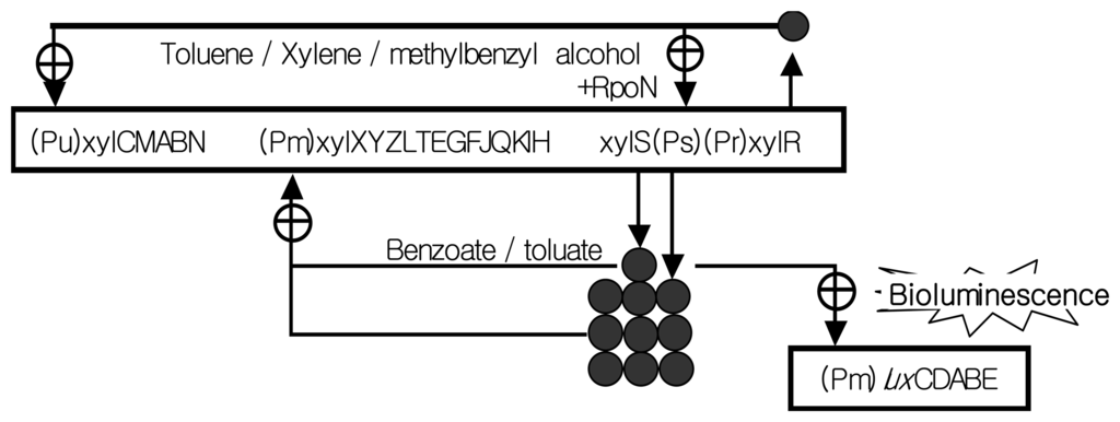 The tested recombinant strain Pseudomonas putida mt-2 KG1206 (called KG1206)contains the intact TOL plasmid and Pm-lux fusion plasmid, where Pm is the promoter of the lower or meta operon (13 genes) of the TOL catabolic plasmid pWW0 and is responsible for producing bioluminescence in the presence of toluene analogs (indirect inducers; toluene, m-MBA, xylene isomers) as well as their metabolites (direct inducer; m-toluate, and benzoate) (Figure 1) [8,9]. Intermediates of toluene analogs, such as benzoate and m-toluate, activate XylS regulatory protein, whereas toluene, m-MBA, and isomers of xylene activate XylR regulatory protein. Both XylS and XylR proteins positively control their promoters. XylR controls the upper pathway promoter (Pu) and induces expression of xylS gene, which is responsible for the production of XylS protein as well as regulation of the lower pathway promoter (Pm). For KG1206 strain, inducer chemicals bind to inactive XylS protein and induce a conformational change, enhancing interaction with the promoter site. Activated XylS protein then binds to the promoter Pm to produce bioluminescence from Pm-lux gene in the recombinant strain [7].