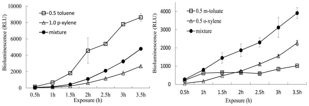 After the initial definitive tests, 1.0 and 0.5 mM each of m-toluate, toluene, and m-, o-, p-xylene were used to evaluate the effects of binary mixtures of inducer pollutants on bioluminescence induction. In general, bioluminescence intensities of mixtures were either higher or lower than those of single inducers. Two representative results of the bioluminescence activities of inducer mixtures and single inducers are compared in Figure 2. After exposure for 3.5 h, a mixture of 0.5 mM toluene and 1 mM p-xylene produced 4795 RLU, whereas toluene and p-xylene as single inducers produced 8640 and 2670 RLU, respectively. In contrast, a mixture of m-toluate and o-xylene (final 0.5 mM) showed higher bioluminescence (3910 RLU) compared to 0.5 mM o-xylene and 0.5 mM m-toluate, which showed 2270 and 1918 RLU at 3.5 h, respectively.
