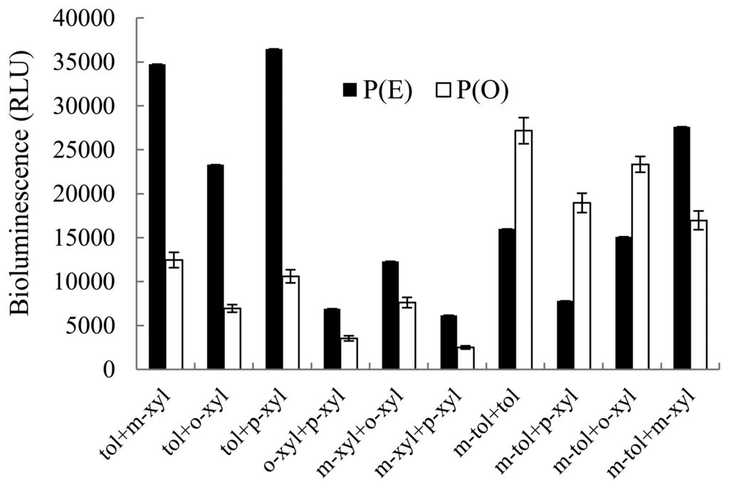 For binary inducer mixtures, seven out of 10 mixture groups produced lower bioluminescence (29%–62%) compared to theoretically expected ones P(E). Therefore, the interactive effects of these mixture chemicals were antagonistic. In contrast, three other groups (mixtures of m-toluate and toluene, m-toluate and p-xylene, and m-toluate and o-xylene) showed higher bioluminescence intensities (141%, 243%, and 155%, respectively) compared to theoretically expected ones (synergistic mode of action), and no additive mode was observed. Based on Student's t-test, statistically significant differences were observed between P(E) and P(O) in all groups (p-values ranging from 0.0001 to 0.0228).