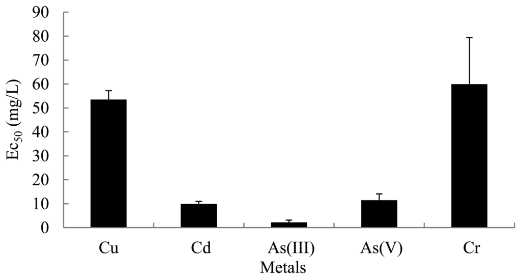 Prior to testing the mixtures, the effects of single metals on bioluminescence activity were determined. Five single metals were exposed to each inducer chemical (toluene, m-toluate, and three xylene isomers) (Figure A2). There were no differences between exposure to direct and indirect inducers. However, the same metal had a similar effect (EC50) on bioluminescence activity of the strain, regardless of the inducer. Average EC50 values of each metal with different inducers are shown in Figure 4. Similar bioluminescence activities were generally observed among the same metal exposed to different inducers. Among the tested metals, arsenite showed the highest inhibitory effects with different inducer chemicals (EC50 1.2–3.8 mg/L) under all tested conditions. On the other hand, copper and chromate showed the lowest effects (EC50 53.5 mg/L and 59.9 mg/L, respectively).Effects of metals were as follows: As(III) 2.2 ± 0.97 mg/L > Cd 9.9 ± 1.07 mg/L, As(V) 11.5 ± 2.60 mg/L ≫ Cu 53.5 ± 3.72 mg/L, Cr 59.9 ± 19.48 mg/L. Toxicities of As(III) and Cd based on bioluminescence activity were much greater than those of Cu and Cr. Chromate (K2CrO4) toxicity was nearly 25 times lower than that of As(III) in terms of EC50. Metals are expected to respond differently to various chemicals depending on type of test organism, test conditions (pH, temperature, physiological state), end points, and so on [27]. Hsieh et al. [27] reported the following toxicities by the Microtox method: Cu > Cr > Cd > As. For this reason, a battery of bioassays could be one solution to assess the toxic effects of pollutants [28]. Several mechanisms could explain the lower inhibitory effect of chromate in bacteria: (1) blockage of chromate transport resulting from mutation of sulfate permease protein; (2) chromate-active efflux; or (3) activation of the chromate reduction mechanism. Fulladosa et al. [29] reported a low toxicity (high EC50 > 2 mM) of chromate with respect to growth of the bioluminescence-producing strain Vibrio fischeri. The ability of V. fischeri to reduce chromate to chromite may be responsible for the tolerance of the strain to this metal. Although the same metal had a similar effect (EC50) on bioluminescence activity, the Pm-lux gene exposed to o-xylene was more significantly inhibited (lowest EC50 value) by nearly all metals regardless of the inducer. Interestingly, Cu, Cd, and As(V) with o-xylene showed the lowest EC values compared to sets with other inducers. Two other metals, As(III) and Cr with o-xylene, were not toxic, although their EC50 values were within the error range of most toxic metals (data not shown).