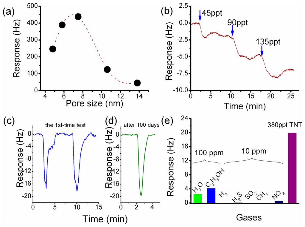 After the functionalized sensing material of HFIP-grafted SBA-15 (denoted as HFMS) is prepared, the as-prepared HFMS is dispersed in deionized water under ultrasonic, and then loaded onto the top-surface of our developed resonant micro-cantilever by using an Eppendorf made micro-manipulator. Figure 9 shows the HFMS-loaded cantilever that has been with the resonance-exciting heater and the signal-readout piezoresistors integrated. According to our characterization results shown in Figure 10a, the optimal pore size of the sensing nano-material is 7–8 nm. As is shown in the sensing experiment results of Figure 10b, about a 2.6 Hz frequency drop is obtained when the sensor is exposed to 45 ppt TNT vapor. Compared to the 0.4 Hz noise-floor, the tested sensing signal is about six times in amplitude. When the concentration of TNT vapor increases to 90 ppt and 135 ppt, the corresponding outputs increase linearly. As the reproducible response of 18 Hz to 380 ppt TNT demonstrated in Figure 10c shows, the repeatability of the sensor is quite good. According to the research, the sensor shows fast response/recovery performance, e.g., the responding time to TNT is only about 1 min and the signal recovering time is about 2 min. Due to the covalent-bond graft, the long-term stability of the sensor secures reliable application for more than 100 days (see Figure 10d). The selectivity of the HFIP grafted SBA-15 to several kinds of interfering gases is shown in Figure 10e that indicates satisfactory results. According to the measured data, the TNT sensor exhibits lower than 5 Hz response to all the interfering gases of water (H2O), ethanol (C2H5OH), hydrogen (H2), hydrogen sulfide (H2S), methane (CH4), nitrogen dioxide (NO2) and sulfur dioxide (SO2). It is worth notifying that the concentration of the interfering gases is herein 10–100 ppm while the TNT concentration is only 380 ppt.