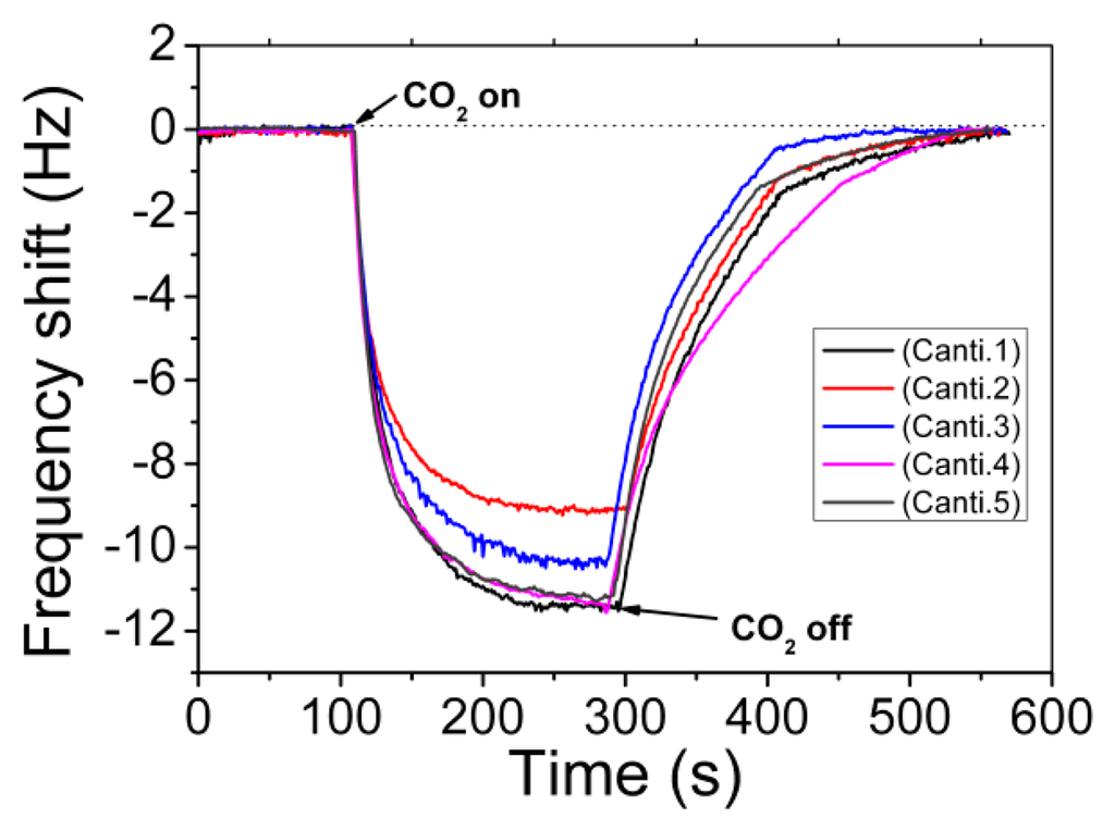 Five cantilever sensors are randomly taken from the same batch (denoted as canti. 1–5) as examples, and the consistency of the sensing performance to CO2 is well confirmed by the sensing experiment results shown in Figure 12. Before micro-gravimetric detection, the original resonant frequency values of the five cantilever sensors are recorded as 96.285 kHz, 96.291 kHz, 96.299 kHz, 96.303 kHz and 96.310 kHz, respectively. After sequential sensing to CO2, the corresponding frequency-shift signals are 9.1 Hz, 10.3 Hz, 11.1 Hz, 11.2 Hz and 11.3 Hz, respectively. The maximum relative error in sensitivity is less than 15%. The satisfactory uniformity verifies that the developed “one-pot” batch MTF-functionalization method can be used in volume production of the nano/micro combined high-performance gas sensors. According to the study, the LOD of the sensor is better than 300 ppm.