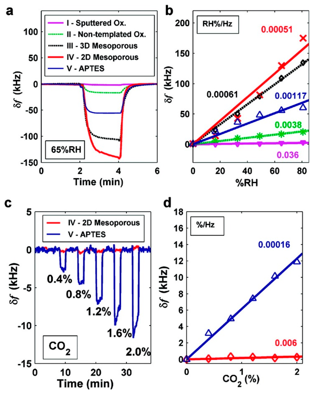 - Lee, H.J.; Park, K.K.; Kupnik, M.; Melosh, N.A.; Khuri-Yakub, B.T. Mesoporous thin-film on highly-sensitive resonant chemical sensor for relative humidity and CO2 detection. Anal. Chem. 2012, 84, 3063–3066. [Google Scholar]