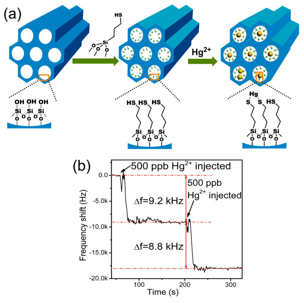 - Lou, H.H.; Zhang, Y.; Xiang, Q.; Xu, J.G.; Li, H.; Xu, P.C.; Li, X.X. The real-time detection of trace-level Hg2+ in water by QCM loaded with thiol-functionalized SBA-15. Sens. Actuators B Chem. 2012, 166, 246–252. [Google Scholar]