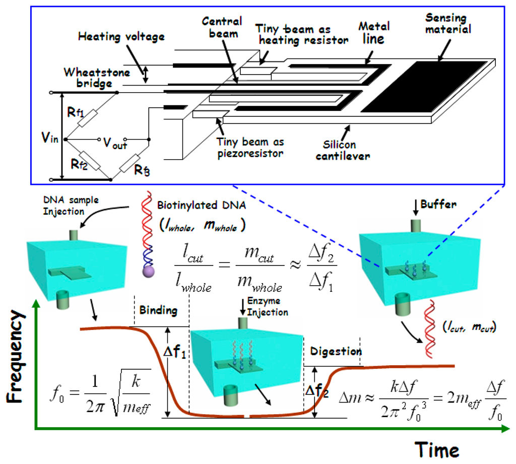 In gene-level detection, double-strand DNA is more stable than single-strand DNA and, thus, is more suitable for quick and accurate analysis. However, the conventional double-strand DNA detection methods like electrophoresis are generally time-consuming and expensive [80]. Since the molecular weight of the double-strand DNA fragments (after gel electrophoresis) always needs to be compared with the molecular weight marker, our group recently developed a new micro-gravimetric method to recognize double-strand DNA [81]. According to the restriction enzyme effect, there are one or more specific sites, along the chain of a certain double-strand DNA, for digestion of corresponding restriction enzyme. After digestion by an enzyme, the double-strand will be cut into two segments with a certain ratio in length. Since this ratio of length is proportional to the ratio of mass between the two segments, the enzyme digestion site can be identified by measuring the relative mass change after the site-specific enzyme cutting-off. This new idea has been realized with our micro-gravimetric sensing platform, where the mesoporous silica with huge surface area has been used to improve the binding of double-strand DNA sample on the resonant sensor. The sensing scheme is outlined in Figure 15.