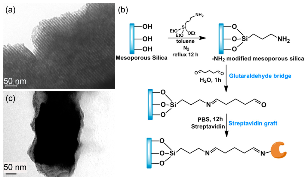 Herein, the sample immobilization of the double-strand DNA is completed by using the huge surface area mesoporous-silica as media material. The pore diameter of the used mesoporous-silica raw material is about 10 nm, as depicted in the TEM image of Figure 16a. Pre-functionalization of streptavidin onto the mesoporous silica is implemented with the following steps. 3-aminopropyl-triethoxysilane (APTES) is firstly introduced to react with the surface silanol-group to obtain −NH2 functionalized mesoporous-silica. Then, glutaraldehyde is reacted with the −NH2 group to form an aldehyde tail. After that, streptavidin is grafted on top of the aldehyde group. The route of the streptavidin functionalization onto the mesoporous-silica surface is shown in Figure 16b. The morphology of the streptavidin-functionalized mesoporous-silica is illustrated in the TEM image of Figure 16c.