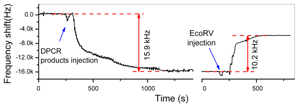 The double-strand DNA direct detection method to the pathogen of E. coli O157:H7 has been experimentally verified by detection of the 3776-bp chain that contains stx2 gene of E. coli O157:H7. The site-specific digestion with the enzyme of EcoRV (at 2635-bp) is experimentally implemented, resulting in accurate frequency signal for DNA identification. Figure 17 shows the real-time recorded frequency response of the resonant cantilever during the whole processes of the 3776-bp double-strand DNA bound on the cantilever and the enzyme specific-cutting at the restriction site of 2635-bp of the chain. After the PCR (polymerase chain reaction) product of biotinylated DNA (with 1 ng/μL concentration) is injected into the detection chamber, the frequency of the cantilever continually decreases along with the process of the DNA double-strands bound onto the functionalized mesoporous-silica that has been pre-loaded on the cantilever. The frequency reaches to a stable state in 10 min that indicates completion of DNA sample immobilization. The frequency-shift value of Δf1 = 15.9 kHz was recorded, which indicated 1.8 ng DNA bound onto the cantilever. After the sensor is balanced by injecting the buffer of EcoRV enzyme from the inlet of the detection chamber, the EcoRV solution is introduced into the chamber. During the site-specific digestion process, the frequency of the micro-cantilever rapidly increases by Δf2 = 10.2 kHz. Thus, the experimentally obtained ratio between the two frequency-shift values is measured as Δf2/Δf1 = 64.2%. Due to that the adsorbed mass is much smaller than the effective mass of the resonant cantilever itself, the ratio of Δf2/Δf1 should be equal to the ratio between the mass of the bound DNA and the cut-off mass by enzyme. Since the mass per DNA base-pair (bp) is a constant, Δf2/Δf1 should be also equal to the ratio between the strand-length changes during the DNA immobilization and the enzyme cutting, i.e., lcut/lwhole = 64.2%. According to the known DNA cutting site of 2635-bp from the original 3776-bp chain, the theoretical mass ratio between the removed DNA segment and the whole DNA chain should be lcut/lwhole = 2635/3776 = 69.8%. With a small part of uncompleted enzyme digestion taken into account, the measured ratio of 64.2% can be considered being consistent with the theoretical ratio of 69.8%. Hence, this quantitative method for identifying the double-strand DNA is experimentally verified. When the purified DNA sample of identical concentration is used in the detection experiment, it still generated similar detecting results. Thus, there is no need to purify the PCR products when this detection technique is employed.