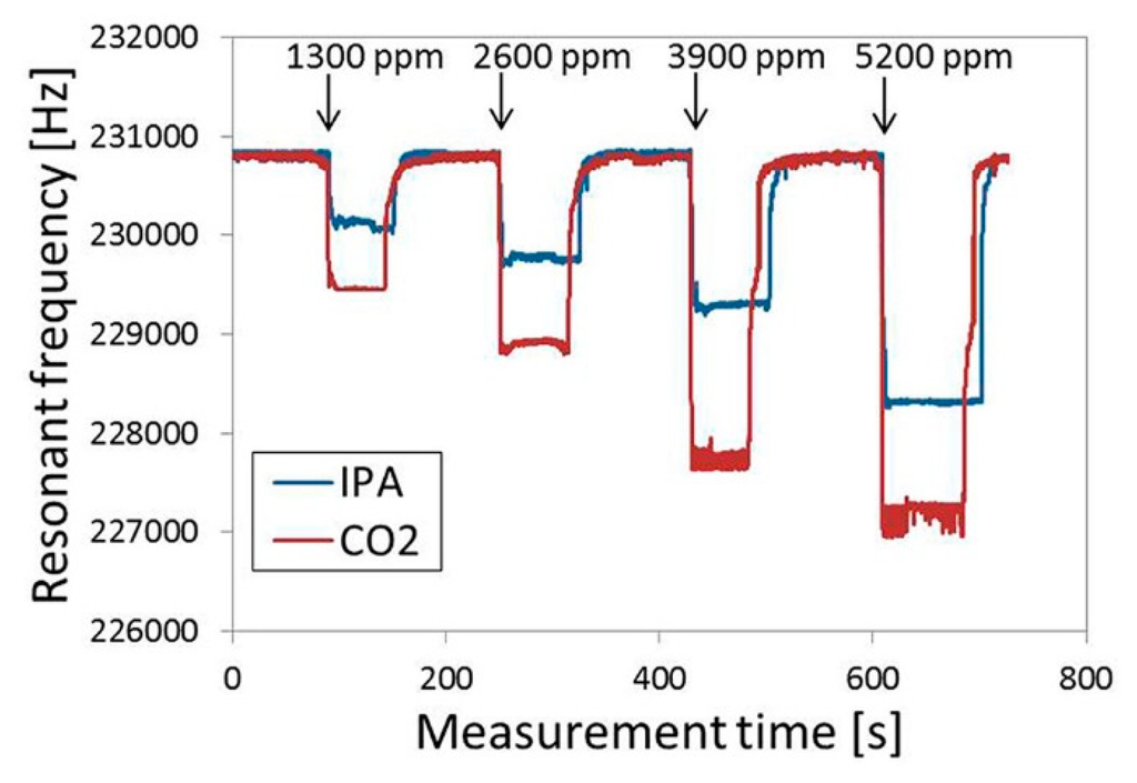 Similar work has also been successfully implemented by Lee and the co-researchers [74,75]. In their work, they also use the EISA method to self-assemble mesoporous silica thin-film onto capacitive ultrasonic transducer (CMUT), which is another kind of resonant sensors fabricated by using micromachined technology. In order to detect humidity change, thermally stable continuous SBA-15 mesoporous silica film are directly grown on the top surface of the batch fabricated CMUT. Compared with the CMUT sensors with the sputtered oxide as humidity sensing material, more than one order of magnitude improvement in sensitivity (5.1 × 10−4% RH/Hz) is achieved. In their study, -NH2 functionalized MTF is also self-assembled on the CMUT to form CO2 sensor. With the results shown in Figure 13, the LOD to CO2 gas reaches about 182 ppm.