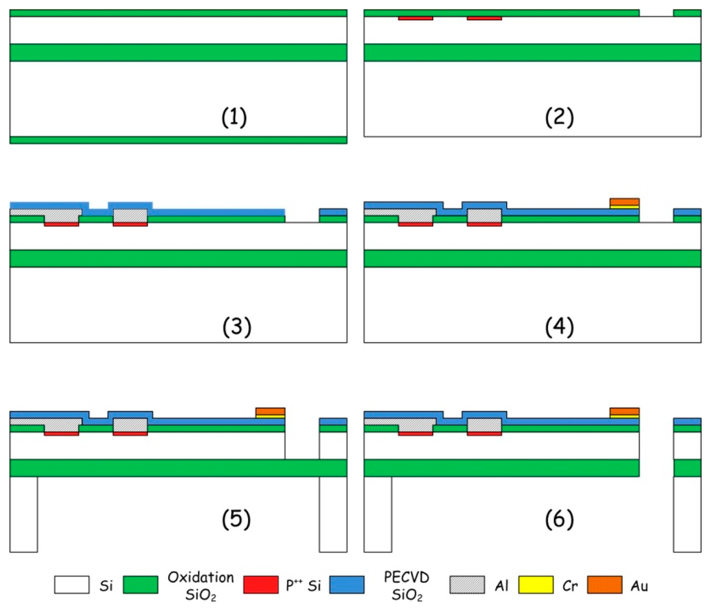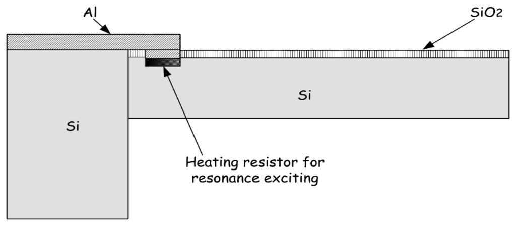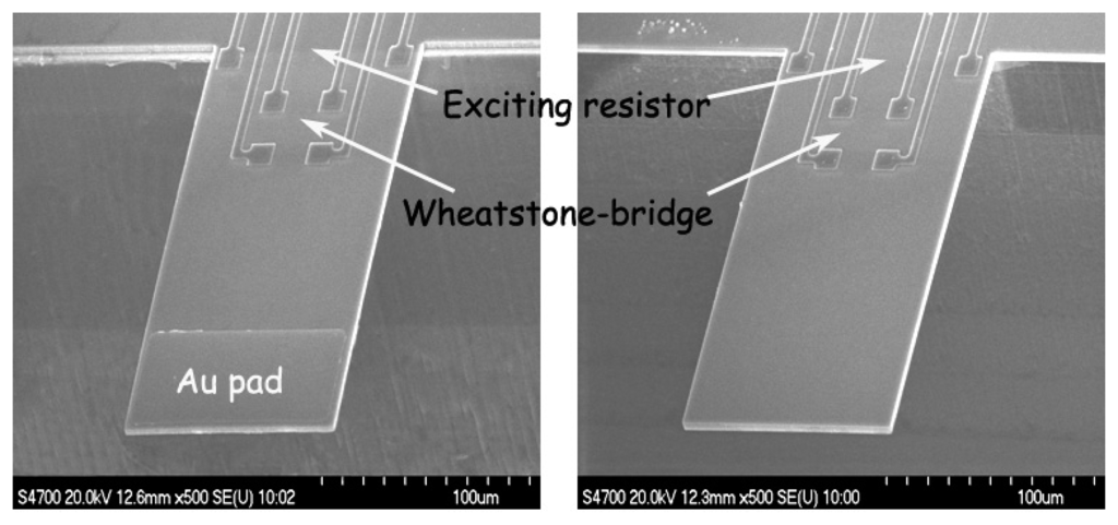 For chemical vapor sensing, a resonant micro-cantilever has been optimally designed and fabricated with silicon micromachining techniques, where the resonance exciting micro-heater and the self-sensing piezoresistor are both integrated [48]. Figure 2 shows the cross-sectional schematic of the resonant cantilever. A boron-doped resistor is laid near the root of the cantilever to serve as the micro-heater. Thermal waves were generated by heating the resistor with AC electric current and propagated through micromechanical vibration of the silicon cantilever. The pulsed heating induces thermal expansion and further causes mechanical bending strain of the cantilever. For the silicon cantilever with a SiO2 insulating thin film on top, the generated bending strain can be originated from either the difference in thermal expansion coefficients of the Si/SiO2 double-layer or the temperature gradient across the cantilever thickness. Figure 3 outlines the fabrication process flow for the integrated resonant cantilever. Figure 4 shows two SEM images of the fabricated micro-cantilevers. Besides the micro-heater, a piezoresistive Wheatstone-bridge is also integrated for frequency signal readout.