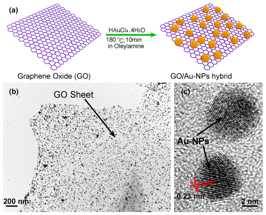 In our group, we use an in-situ method to self-assemble gold nanoparticles (Au-NPs) onto the graphene nanosheets, thereby constructing nanoporous-layered three-dimensional (3D) hierarchical graphene foam after solvent removal [109]. Figure 20a shows the preparing process of the GO/AuNPs sample, where oleylamine plays the key reactant and solvent. It is known that there exists a strong interaction between the −NH2 group in oleylamine and the oxygen-containing group (like −COOH, −OH or epoxy group) in GO sheet. Besides, the similarity between olefin group in oleylamine and benzene-ring in GO sheet enhances inter-miscibility of GO in oleylamine. Under stirring, the compressive GO material with accurate mass is easily dispersed in oleylamine to form a stable and high-concentration GO dispersion. Thereafter, the gold precursor of HAuCl4·4H2O is added into the dispersion and, then, AuCl4− ions are adsorbed onto the GO surface via coordination effect between the oxygen-containing group in GO and the AuCl4− ion. With the help of the olefin group in oleylamine, the gold ions are reduced to form Au-NPs at high temperature. The TEM characterization results shown in Figure 20b indicate that the well dispersed Au-NPs are in-situ grown onto the GO sheets. The high resolution TEM (HR-TEM) image in Figure 20c clearly shows two Au-NPs (with about 5 nm in diameter), where the crystal lattice fringes of 0.23 nm match well with the (111) plane of gold. In addition, the density of the Au-NPs decorated on the surface of the GO sheet can be tuned conveniently by adjusting the weight ratio between GO and HAuCl4·4H2O in the range of 0.15–1.3. In our experiment, the weight ratio of Au-NPs in the hybrid can be up to 60 wt%. In the nanoporous graphene material, the Au-NPs are used as building blocks to prevent graphene sheets from aggregation. Using this method, the highly effective specific surface-area can be kept. After that, functional organic groups can be grafted either on the activate sites of the graphene or on the surface of Au-NPs for chemical sensing.