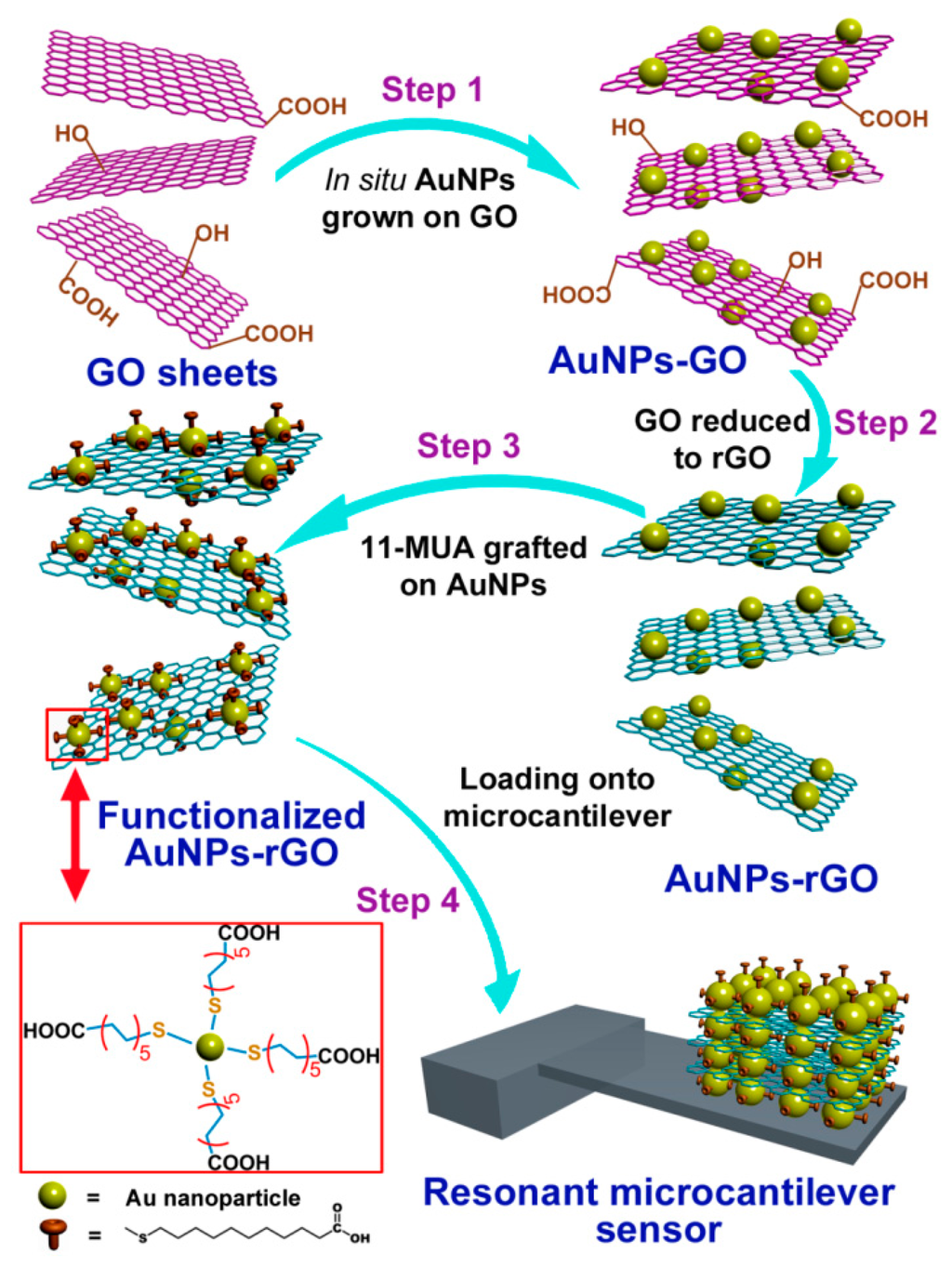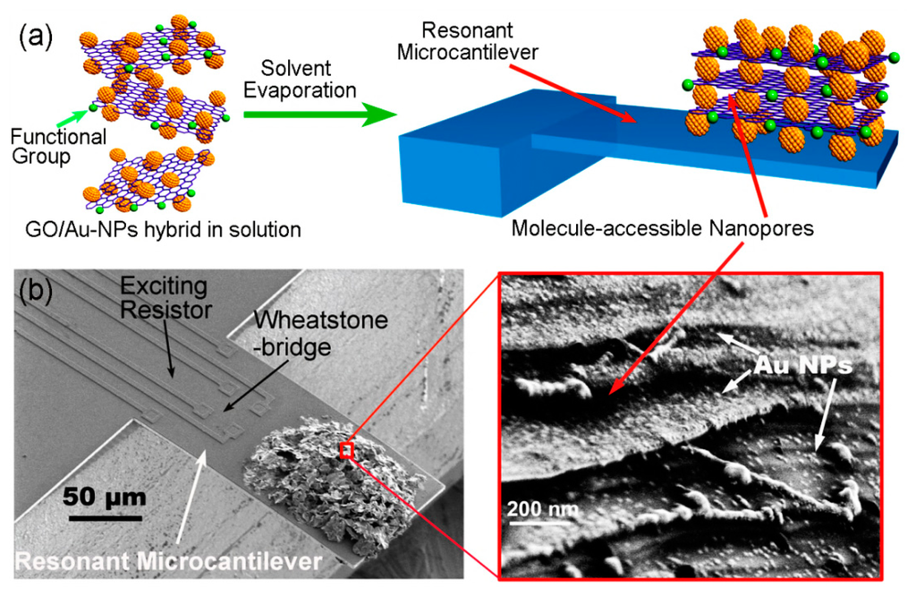 Instead of grafting organic groups onto the oxygen-containing active sites of GO sheets (mainly at the edges of the GO sheets), surface modification of organic groups onto noble metal (e.g., gold) is the alternative functionalization approach [110–112]. With the alternative method, the functional groups can be grafted onto the metal nanoparticles instead of the GO sheet itself. Thus, in order to prepare sensing materials with hydrophobic characteristic, the hydrophilic GO sheets bearing the oxygen-containing groups should be transformed back to rGO (reduced graphene oxide) that becomes hydrophobic again. To obtain rGO/Au-NPs, ascorbic acid (Vitamin C) is used as reducing reagent to treat the raw material of GO/Au-NPs. Then, −COOH groups can be grafted onto Au-NPs via the well-known self-assembly method that has been detailed in the previous literatures [113]. Briefly, 11-mercaptoundecanoic acid (11-MUA) is firstly dissolved into ethanol to form a stock solution, where a small amount of H2O is added as catalyst. Then, AuNP–rGO hybrid, which is pre-activated for 3 min under O2 plasma, is immersed into the stock solution for about 8 h. The samples are then sequentially filtrated and rinsed with ethanol and distilled water for several times to remove the chemical residues. After drying under vacuum, −COOH functionalized nanoporous material can be finally obtained. The whole process of the sample preparing and sensor construction is schematically shown in Figure 23.
