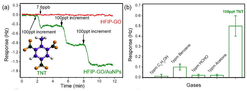 Before TNT detection, the resonant frequency of the micro-cantilever is measured as about 75 kHz in air, with the signal noise-floor being lower than 0.1 Hz. As is shown in Figure 22a, when TNT vapors with the concentrations of 100 ppt, 200 ppt and 300 ppt are sequentially exposed to the sensor, step-by-step frequency shifts are measured, with an average sensing response of about 0.5 Hz to 100 ppt increment of TNT. According to the known 1.53 Hz/pg mass sensitivity of the resonant sensor, the mass of 100 ppt TNT molecules adsorbed on the HFIP-functionalized GO nanoporous sensing material can be worked out as 327 fg. Due to the covalent-bond grafting of the HFIP groups, the long-term stability of the sensor is quite satisfactory. After storage for six months, the repeated TNT detection with the same sensor results in negligible decrease in sensitivity. To investigate selectivity, several common vapors, such as ethanol, acetone, formaldehyde and benzene, are selected as interfering gases for experimental comparison. As is shown in Figure 22b, the HFIP-functionalized GO/Au-NPs nanoporous sensing material shows a good selectivity to TNT of 100 ppt concentration, while all the interfering vapors are with a much higher concentration of 1 ppm. The ultra-high selectivity may be attributed to the highly specific interaction between HFIP group and TNT molecule, which has been proved in the previous literatures [63].