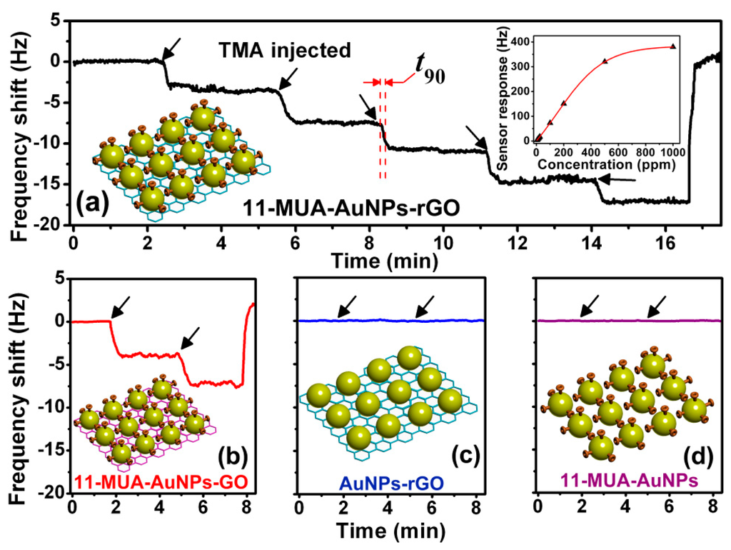 To form a micro-gravimetric sensor for amine detection, −COOH functionalized nanoporous sensing material is prepared and in-situ stacked at the free end of a resonant cantilever. As is shown in Figure 24a, the sensor outputs serial frequency-shift signals when it exposed to TMA vapor with stepwise increased concentration. The sensing signal of the sensor is about 3.5 Hz for 5 ppm TMA. Additionally, there is no obvious attenuation in sensitivity during the multi-concentration detection. Figure 24b shows that, compared with the sensor loaded with 11-MPA functionalized AuNPs-GO (i.e., the GO is not reduced back to rGO), the TMA detection sensitivity of the current sensor with AuNPs-rGO is almost the same. Due to the nanoporous structure of the sensing material, the response of the sensor is very rapid with the response time (t90) being shorter than 30 s, where t90 is defined as the time period corresponding to the output signal amplitude reaching 90% of the maximal output value. The recovery of the sensing signal to its original baseline is also less than 30 s after the multi-concentration detection. The AuNPs-rGO without functionalization and the 11-MUA functionalized AuNPs are also used for the TMA sensing experiment. The sensing results show negligible response to 5 ppm TMA (see Figure 24c,d). The results verify that the sensing effect originates from the sensing-group functionalization.
