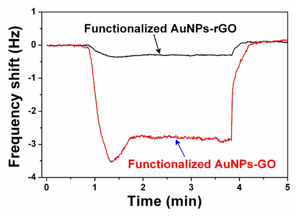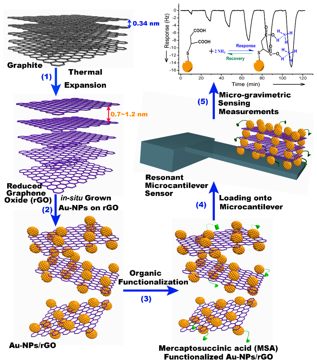 - Xia, X.; Guo, S.; Zhao, W.; Xu, P.; Yu, H.; Xu, T.; Li, X. Carboxyl functionalized gold nanoparticles in situ grown on reduced graphene oxide for micro-gravimetric ammonia sensing. Sens. Actuators B Chem. 2014, 202, 846–853. [Google Scholar]