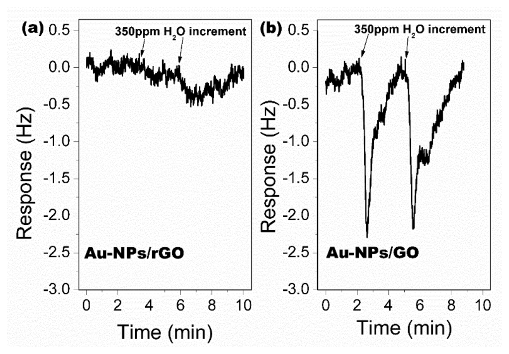 As described above, the rGO sheets directly obtained from the thermal decomposition method feature higher hydrophobic property than GO, because a large amount of the oxygen-containing hydrophilic groups are decomposed during the pyrolysis process, and the amount of the oxygen-containing groups in rGO is much lower than that in GO. The contact-angle (CA) measurement results indicate that the CA of rGO is about 72.5°, which is in contrast to the CA of GO of 35.6°. The Au-NPs/GO and the Au-NPs/rGO are both used for sensing experiment to water. As is shown in Figure 27, the Au-NPs/GO sensor outputs about a 2 Hz response to 350 ppm water vapor, while the sensor with Au-NPs/rGO generates negligible response to water vapor. The results well confirm that Au-NPs/rGO is advantageous in minimizing the influence from environmental humidity.