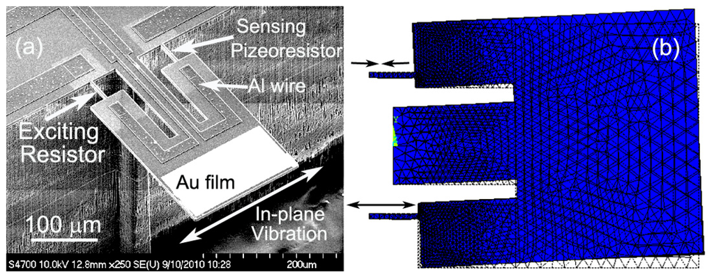 For real-time bio/chemical detection in liquid environment like aqueous solution, improved resonant cantilever structures is designed that can be operated in higher resonance modes than fundamental bending mode resonance [49]. With lower liquid damping and drag-force effect, the higher-mode resonators can achieve high enough Q-factor for frequency-shift detection in liquid. Compared with bending-mode of conventional cantilever, in-plane resonance mode is advantageous in enduring lower liquid resistive effect and gaining higher Q-factor in liquid. As is shown in the SEM image of Figure 5a, the double tiny-beams structured resonant cantilever is designed and fabricated for sensing in in-plane resonance mode. The in-plane mode resonant sensor consists of a central supporting-beam and a pair of silicon tiny-beams at its both sides, with one for electro-thermal resonance excitation and another for piezoresistive frequency-readout. A thin sensing plate is loaded at the end of the central supporting-beam and linked with the two tiny-beams via two overhanging legs of the sensing plate. The resonance exciting resistor and the sensing piezoresistor are embedded in the silicon tiny-beams by boron doping. The distance between the tiny-beam and the central supporting-beam has been optimally designed so that the tiny-beams can only straightly (axially) compress or stretch instead of bending movement. This pure axial vibration of the tiny-beams is achieved by counteracting between the positive lateral movement and the negative rotating movement of the sensing plate when the structure resonates in the in-plane mode. By supplying a pulsed current through the thermal exciting resistor, the pulse-heating induced extensional expansion in longitudinal direction of the tiny-beam will lead the sensing-plate into in-plane swing resonance. At another side, the tiny-beam piezoresistor is forced into pulsed compression and the piezoresistive frequency signal can be electrically read out. The ANSYS-simulated resonance mode shape is illustrated in Figure 5b. When the AC current flows through the exciting tiny-beam to cause the pulsed thermal expansion, the in-plane resonance mode of the sensor is confirmed, while the unwanted out-of-plane resonant modes at lower frequencies can be well depressed.