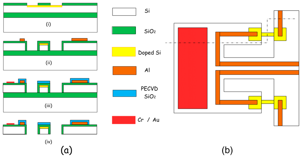 Figure 6a depicts the fabrication process of the in-plane mode piezoresistive resonant micro-sensor for gravimetric detection in liquid. Silicon-on-insulator (SOI) wafer with 5 μm-thick n-type (100) device layer is used as the starting material to form the structure that includes the thin sensing plate for low drag force in liquid. The resistivity of the starting n-type device layer is 1∼10 Ω cm. Figure 5b shows the top-view schematic of the micro-sensor. The cross section shown in Figure 6a is cut along the dash-dotted line in Figure 6b. The fabrication process flow for the resonant micro-sensor is detailed as follows. Firstly, a 0.2 μm-thick SiO2 layer was thermally grown in dry oxidation and wet oxidation, respectively. After patterned for a 1.4 μm-thick photoresist layer, the 1 μm-thick p-type piezoresistor, resonance exciting resistor and the fixed resistors for constructing a Wheatstone-bridge are all formed by boron ion-implantation with 1 × 1015/cm3 dose and 75 keV energy, as is shown in step (i). Deep reactive-ion etching (deep RIE) is employed to shape the structure of the sensor from the front side of the wafer. After wet etching to open the contact holes, a 0.5 μm-thick aluminum layer is sputtered and patterned by wet etching for interconnection wires, which is followed by sintering in forming gas at 450 °C for 30 min (see the step of (ii)). A high-quality plasma enhanced chemical-vapor-deposition (PECVD) silicon-dioxide passivation layer is deposited on top of the structure and patterned by reactive-ion etching (RIE) to cover the aluminum lines. The passivation layer can sustain the aluminum against Piranha solution (7/3 of 98% H2SO4/30% H2O2) cleaning process that will be done before bio/chemical sensing experiment. The passivation layer also serves as an insulate layer to prevent from electric leakage when the sensor is immersed in conductive solution (see step (iii)). Finally, as is shown in step (iv), the resonant microstructure is released by deep RIE and HF etch from the backside of the wafer to remove the handle layer and the BOX (buried oxide) layer of the SOI wafer.