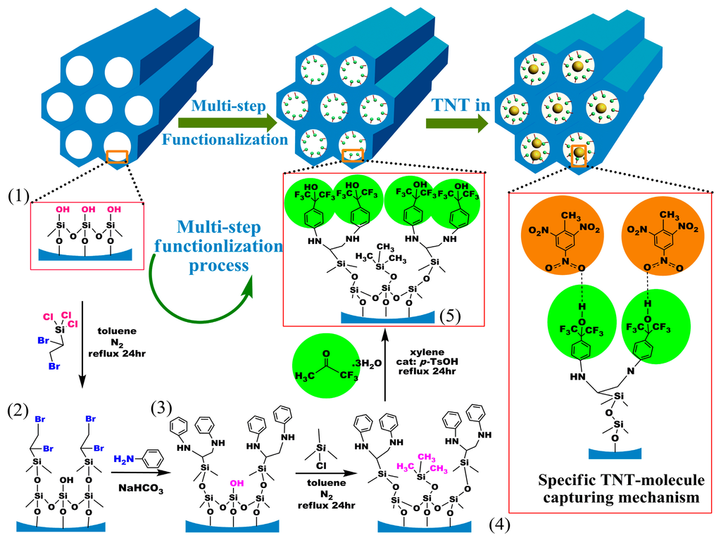 It has been confirmed that benzene-ring linked hexafluoroisopropanol (HFIP) possesses the specific hydrogen-bond to nitroaromatic compounds such as trinitrotoluene (TNT) explosive [62–66]. In order to graft HFIP groups onto SBA-15 mesoporous silica, a layer-by-layer in-wall grafting process is designed and shown in Figure 8.