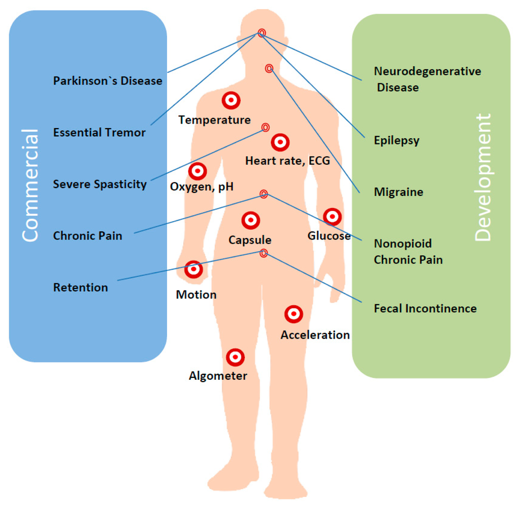 The new generation of implantable devices must overcome some main barriers at its conception stage as for example: size, energy available, power dissipation, power management, signal processing, communication of the measured data, bio-compatibility, chip-level integration, packaging, bioethics, and biosecurity [37]. A conceptual body map of commercial and in development phase implantable sensors is depicted in Figure 1, focussed on the most relevant disease processes based on Oesterle et al. [16].