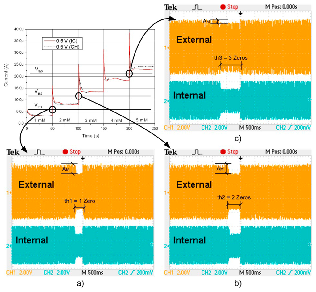 The instrumentation and the communication protocol were validated using several concentrations of K4[Fe(CN)]6 in PBS. In this case, a commercial sensor was used [60]. Several cyclic voltammetries (CVs) were carried out in order to verify the performance of the Control and conditioning modules. These measurements were compared with those obtained with a commercial potentiostat amplifier, the CH 1232A from CHInstruments®. These measurements were also used in order to calibrate the setup, and check the obtained values of the measured current peaks for the oxidation peak (around 240 mV), and the reduction peak (around 170 mV), for each concentration of K4[Fe(CN)]6 in PBS tested, from 1–5 mM. Also, this setup was used to validate the measured CV shapes obtained by the commercial equipment and the full-custom implementation. After the CV characterization some amperometric tests were done for different concentrations of K4[Fe(CN)]6 in PBS: 1 mM, 2 mM, 3 mM, 4 mM and finally 5 mM. Then, an experiment was carried out where the concentration was changed from 1 to 5 mM in time, with a fixed voltage of 500 mV in the sensor. This voltage is defined not at the oxidation peak. For this value of voltage applied in the sensor, the current varies from an average current of 3 μA (1 mM), to 16 μA (3 mM), up to 28 μA (5 mM). This experience was then carried out to validate the detection protocol, for a particular case implemented based on three threshold values. These values were programmed to detect the variations in the concentrations, defined by: Vth1, Vth2, Vth3, as is depicted in Figure 10, taking into account the current expected for each concentration case and defining different windows of comparison. When the first threshold is detected, then a first zero is transmitted, with a programmed width of 250 ms. When the second threshold level is reached, then two zeros are transmitted, in this case with an amplitude of 500 ms. Finally, in the particular case that a threshold Vth3 is defined to detect the highest concentration level, the modulation and data processing module will generate the longest transmission of zeros, in this case, three zeros with a total width of 750 ms.
