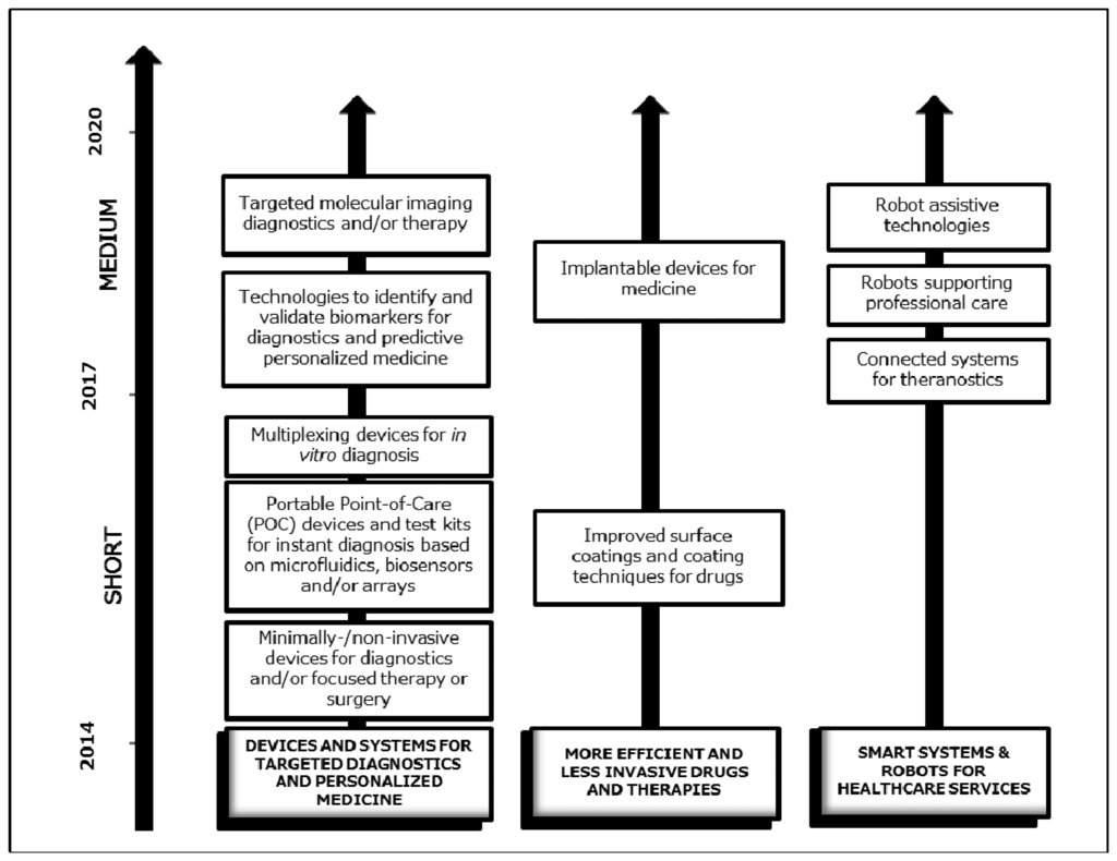 The integration of different Key Enabling Technologies (KETs) represents a vital activity in H2020. About one third of the budget assigned to KETs will go to supporting innovation projects integrating different KETs [119]. Cross-cutting KETs activities will in general include activities closer to market and applications. The global market volume in KETS are 646 billion euros and substantial growth expected is approx. 8% of EU GDP by 2015 [113]. In the Healthcare domain, short (2017) and medium (2020) perspectives of cross cutting KETs are shown in the Figure 11.