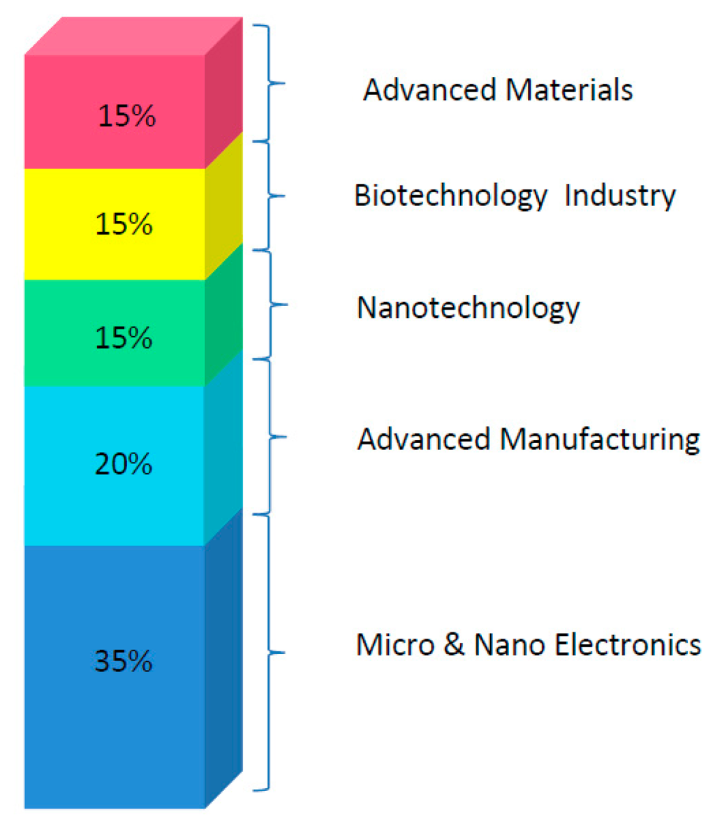 KETs have been selected according to economic criteria, capital intensity, technology intensity, and their value adding enabling role [113]. The six KETs are: Nanotechnology, Micro and Nano Electronics, Photonics, Advanced Materials, Biotechnology Industry and Advanced Manufacturing Systems [114]. Among them, Nanotechnology is one of the most promising KETs due to its economic and social growth potential, since it has been considered the greatest impulse to technological and industrial development in the 21st century and the resource for the next industrial revolution [115–118].
