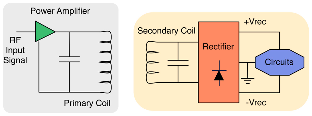Current implementations of communication links in implantable devices are not suitable for many applications because of their poor harvesting efficiency [52]. Energy harvesting solutions must explore if a battery is not an affordable solution: these are defined as self-powered solutions [53]. The first solution could be based on electromagnetic induction [54], with various approaches. Some solutions propose the implementation of coils on a PCB substrate [55], or coaxial aligned coils with or without a ferrite rod [56], with all the attendant problems related to misalignments between the primary powering coil and the implanted secondary coil [57] and electronic implementations for a dynamic control of the power and voltage generated in the implantable in terms of the actual magnetic field that is generated [58]. On the one hand, we have an external element that plays the role of energy wireless power source, based on a class E amplifier, powered by the external battery, which supplies power to the implantable device through the skin [59,60] (see Figure 3). This powering is local, working for instance in the 13.56 MHz ISM (Industrial, Scientific, Medical) band [55], powering 10 mW at a distance of 10 mm between coils. The implantable operating at this ISM band must be placed near to the external generator. In Kilinc et al. [61], a particular case is presented. A wireless power-transfer in vivo implantable device for free moving small animals is derived. The scenario is that the living space for the animal is transformed into a full powering base.