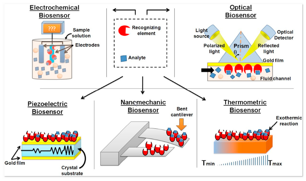 Then, a biosensor is a measurement system for the detection of an analyte that combines a biological component with a physicochemical detector. The general function of a biosensor is to convert binding events between biological receptors and target agents into a signal thanks to a transducer which can be based on an optical, a thermal, a gravimetric or an electrochemical detection (see Figure 4). This last category has gained increasing attention in the last few years. The high sensitivity, low cost and easy miniaturization of the electronic detection taken in conjunction with the wide range of applications, has resulted in these devices becoming a perfect analytical tool in different fields, such as diagnosis of genetic diseases, detection of infectious agents, study of genetic predisposition, development of personalized medicine, detection of differential genetic expression, drug screening, etc.