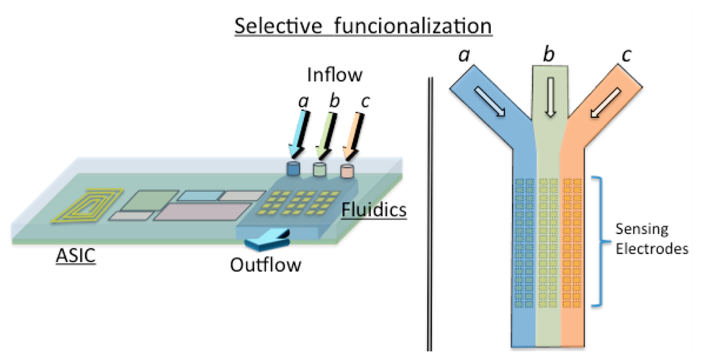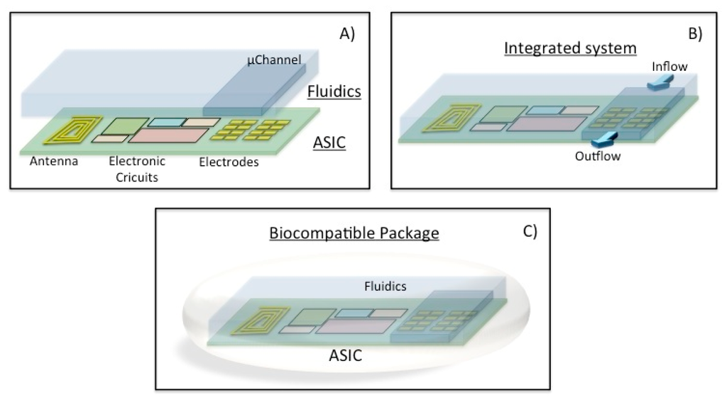 The envisaged concept is applied in the definition of an on-chip configurable array of biosensors. This configuration will take place before the implantation thanks to a standard programmable bio-nano-chip approach [34]. A modular standard lab-on-a-chip approach will be followed to adapt the sensors in a quick, efficient and reliable way and then the implantable system will be placed into the patient (Figure 7). This concept of programmable platform could be adopted with the aim of developing a POC external device. These electrodes will be functionalized before the implantation in the human being thanks to the microfluidics (inflow/outflow) circuitry. Afterwards, the sensors will be checked and the chip cleaned and ready for the implantation.