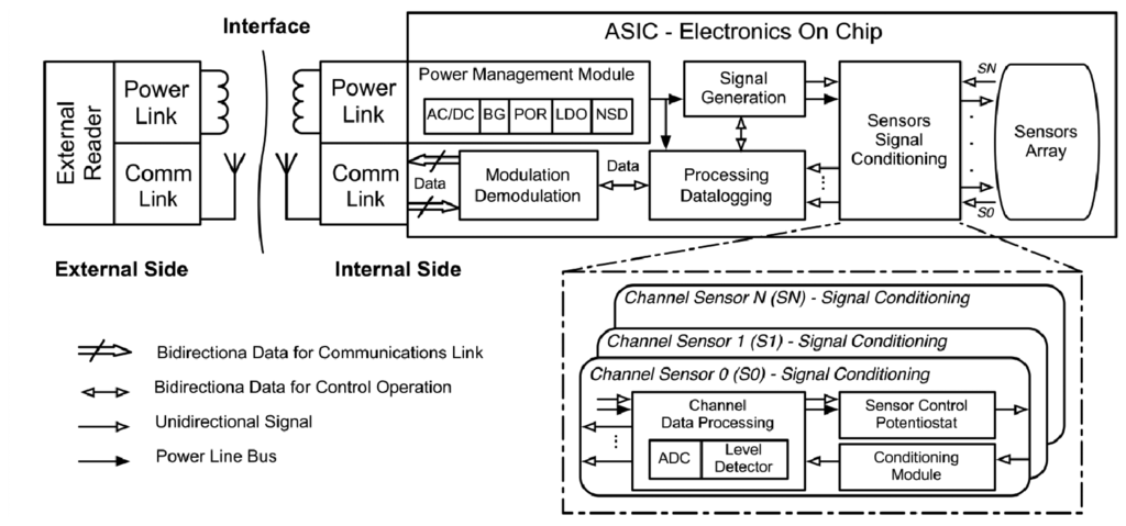 The envisaged integrated electronics is depicted in Figure 8. The ASIC will combine all the necessary electronic modules with the sensors' array of the functionalized biosensors. When the implantable is placed in the body, a programmed check of the state of the biosensors should take place. The system will check the sensors' array during the implantable life, and send a critical message to the final user if a malfunction is detected and the implantable must be removed while it is implanted.