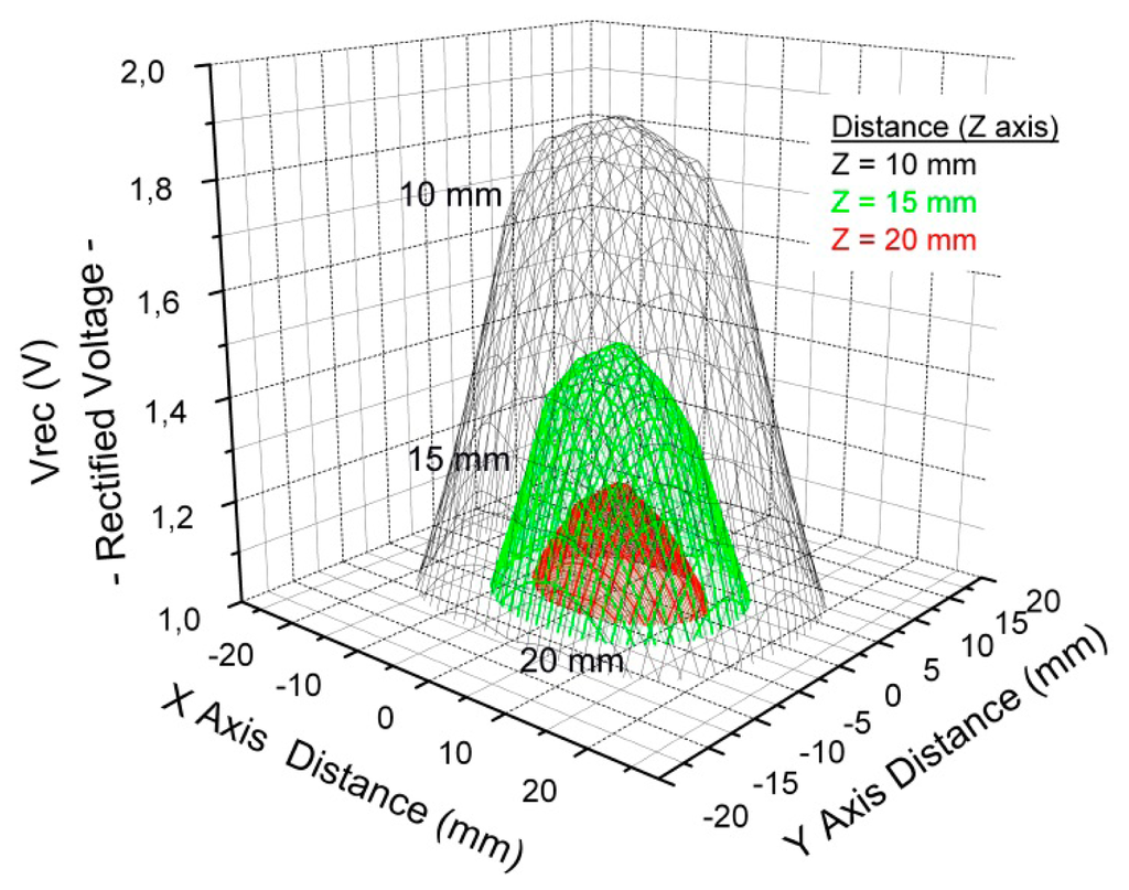 A bipolar power scheme able to supply a regulated differential voltage of ±1.2 V and a maximum current of ±1.5 mA has been implemented. The Texas Instrument® TRF7960 is used as external reader with a maximum emission power of 200 mW at 13.56 MHz. The desired on-chip regulated voltages of ±1.2 V are obtained for a distance up to 20 mm on air between coupling antennae. This analysis has been carried out in terms of the distance (Z-axis), between the external antenna and the coil designed in the PCB which defines the full implantable, that is, between the reader and the implantable. However, it is also necessary to have an approach to the misalignments between both antennas in the XY plane. Figure 9 depicts the rectified voltage (Vrec) distribution in function of the XY misalignment for Z distances of 10, 15, and 20 mm. It can be noticed that the further the antenna is placed from the centre the lower the rectified voltage is. A more accurate study with human tissue is beyond the scope of this study.