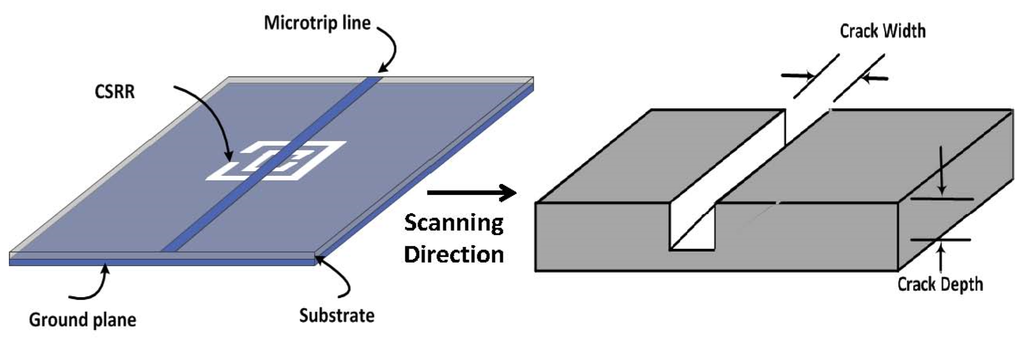 In [7], a method for sub-millimeter surface cracks in metallic material based on the near-field microscopy technique using a complementary split-ring resonator (CSRR) was introduced for the first time and was validated experimentally. The technique used a CSRR as a sensor, which was able to detect sub-millimeter surface cracks with a resolution of and to resolve two adjacent cracks separated by 1 mm. A recent paper by Taehwa et al. [14] used the same CSRR reported in [7] for crack detection in metallic material, but with a substrate integrated waveguide (SIW) for excitation.