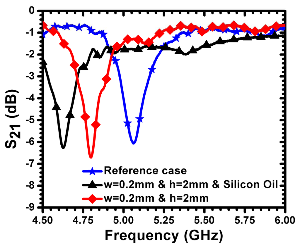 Defects in metallic surfaces, such as sub-millimeter cracks, introduce capacitance that is parallel to the effective capacitance of the sensor. The crack-induced capacitance leads to a downward shift in the resonance frequency in accordance with Equation (1). Therefore, the sensitivity of the sensor can be enhanced by increasing the capacitances of the crack by filling the crack with liquid dielectric material. For this purpose, a crack was filled with silicon oil of a dielectric constant of 2.70. The test sample was fabricated using an aluminum plate with a crack width of 200 μm and a depth of 2 mm. Figure 10 shows the measured frequency of minimum transmission coefficient for the reference case (solid aluminum surface without a crack) and for the cases of the crack with and without silicon oil. The filling of the crack with silicon increased the sensitivity of the sensor by 150 MHz (a shift of more than 435 MHz was registered with respect to the case of solid aluminum without the crack). It is expected that liquids with higher dielectric constants can increase the sensitivity further. In practical crack detection scenarios, silicon oil or other liquids can be applied to the surface of the metallic material to be detected prior to the sensing procedure.