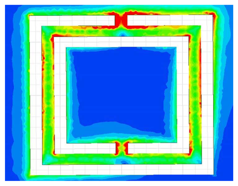 One immediate choice for miniaturization of CSRR sensors is the introduction of lumped inductance in the path of the dominant surface current. By understanding the surface current distribution on the surface of the CSRR, a lumped inductor can be placed at the location of the highest current. Figure 11 shows the current distribution at the resonance frequency of a CSRR of a length of 3 mm. Clearly, the current surface distribution is highly concentrated at the two narrow bridges, indicating that the magnetic field of the sensor is highest around the two bridges, as discussed above. Replacing the narrow bridges by a lumped inductor adds additional inductance, which results in shifting the resonance frequency downward.