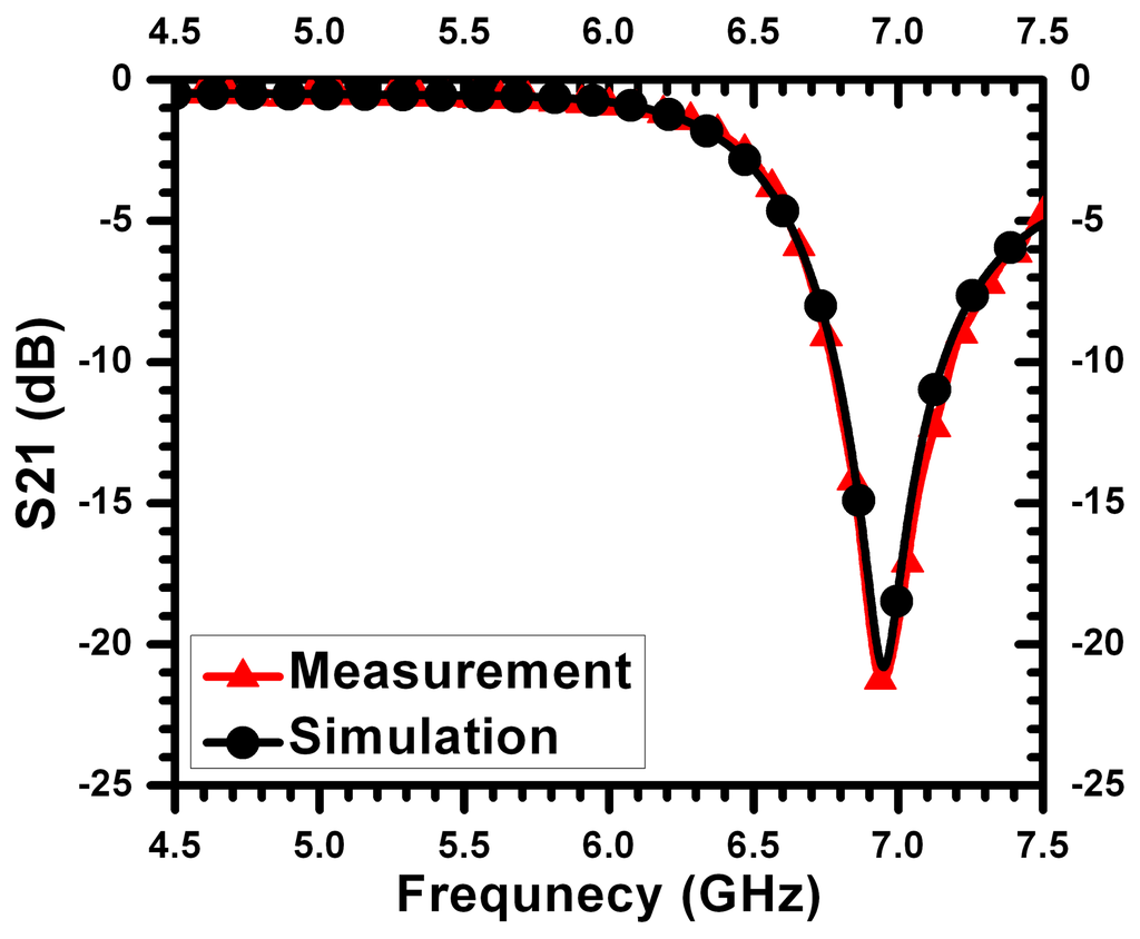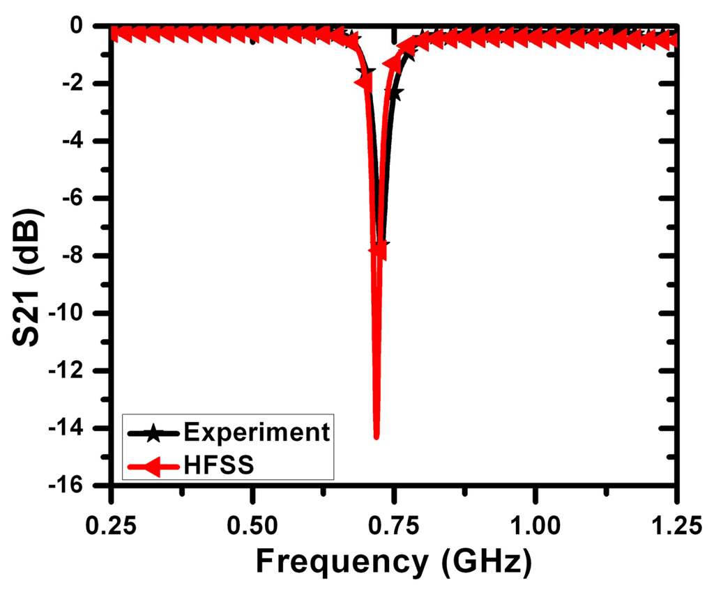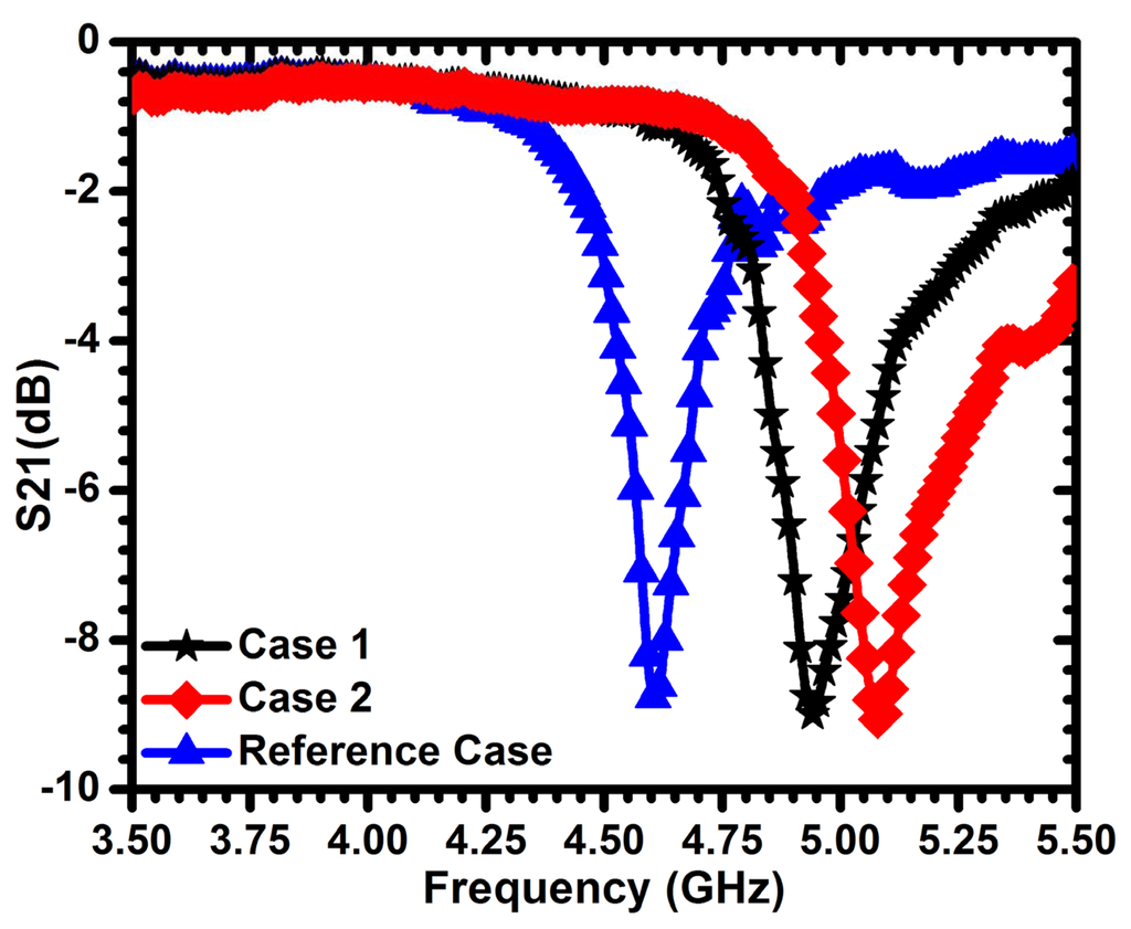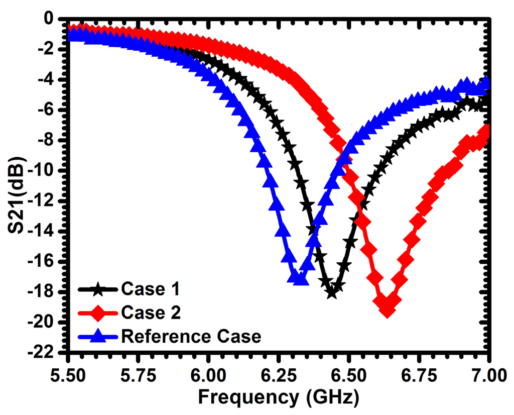 Figure 5 shows a comparison between the simulation and measurements for a sensor with L = 0.27 mm and g = s = t = 0.16 mm. The feeding microstrip line had a width of 1.7 mm on Rogers RO4350 substrate with a thickness of 0.75 mm, permittivity of 3.7 and a loss tangent of 0.003. The agreement between the full-wave simulation and measurements is observed to be very strong, especially at the frequency of minimum transmission. This gives strong confidence in the capability of numerical simulation to determine the response of different sensors and different crack topologies.