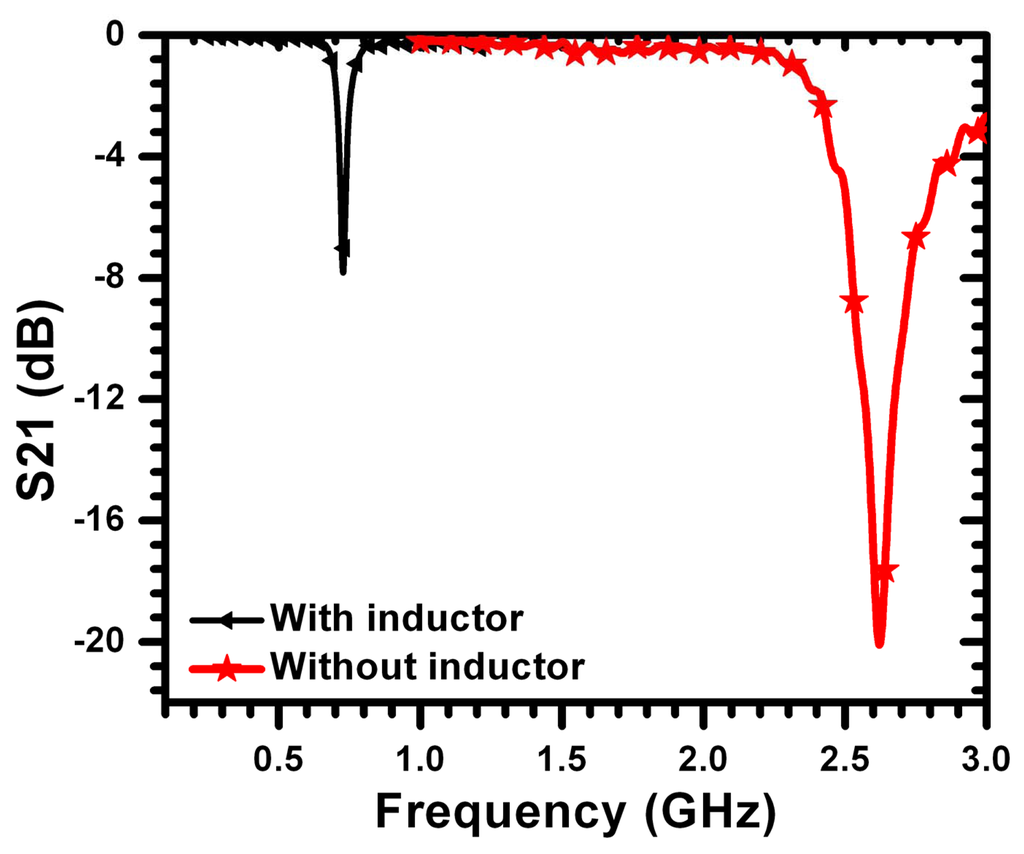 To test the effectiveness of the added lumped inductor on the sensitivity of the CSRR sensor, a CSRR of a length of 6 mm was designed using full-wave numerical simulation and tested experimentally. Then, the narrow bridges were replaced by two 20 nH inductors, as shown in Figure 12. Figure 13 shows the minimum transmission coefficient of the CSRR sensor with the lumped inductors. A strong agreement between the measurement and simulation is observed. Figure 14 shows the experimental result of the CSRR before and after replacing the narrow bridges. We observe almost a reduction of the resonance frequency by a factor of five. Using numerical simulation, the miniaturization, however, was not found to yield sufficient sensitivity for detecting the types of cracks considered above (the resonance frequency exhibited a very small shift, not shown here for brevity). Therefore, while the introduction of lumped elements indeed achieved miniaturization, the sensitivity of the sensor decreased due primarily to the high localization or confinement of the magnetic field within the added inductors.