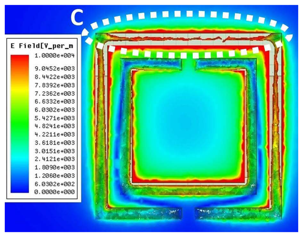 Detection of anomalies, such as cracks in dielectric material, is based on a change in the electric field due to the presence of the anomaly. Therefore, the sensing element for the near-field detection of anomalies, such as cracks in dielectric surfaces, needs to have a dominant electric field. By investigating the total electric field on the surface of the CSRR sensor, we observed a dominant electric field along one side of the CSRR. Figure 18 shows the maximum electric field distribution on a 3-mm CSRR at the resonance frequency. The sensing element for the purpose of detecting dielectric anomalies, therefore, can be considered as the side depicted by the letter C in Figure 18.