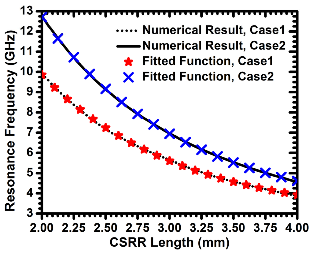 For the purpose of developing CSRR sensor design guidelines, the CSRR length was varied from 2 to 4 mm. Two different values of 0.1 mm and 0.2 mm were considered for the gap separations and trace widths of the structure. The resonance frequencies versus the size of CSRRs (considered to be its length) are plotted in Figure 3. An exponential fitting function was used to find the resonance frequency of a CSRR as a function of its length, expressed as: